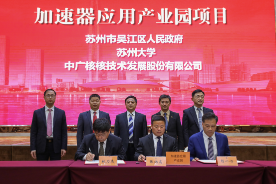 10月25日下午,在苏州市吴江区举办的2018年中国吴江投资贸易洽谈会上,苏州大学与中广核核技术发展股份有限公司、苏州市吴江区人民政府签订三方合作意向书,共同推动加速器应用产业园选址落地,并重点促进电子束治理污水技术应用于吴江区内企业及相关园区。