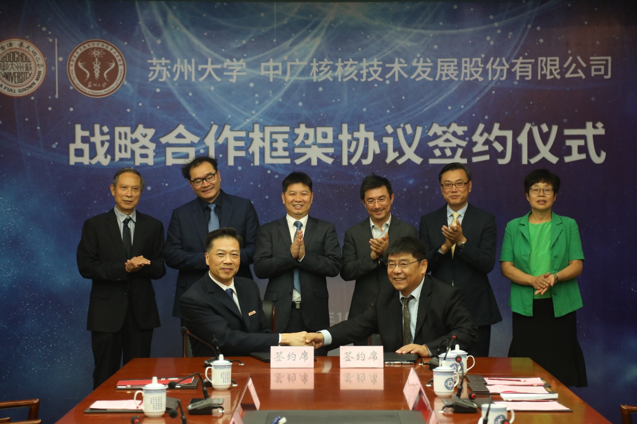 10月8日上午,苏州大学-中广核核技术发展股份有限公司战略合作框架协议签约仪式在独墅湖校区举行。中广核核技术发展股份有限公司党委书记、总经理胡冬明,中广核核技术发展股份有限公司总工程师、中广核达胜加速器技术有限公司董事长林乃杰,中广核核技术发展股份有限公司加速器事业部总经理、中广核达胜加速器技术有限公司总经理肖峰,我校校长熊思东、副校长杨一心,医学部及放射医学与防护学院党政主要领导,以及双方相关部门负责人出席签约仪式。仪式由校党委副书记、副校长路建美主持。