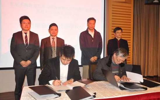 杨一心与赵伟明分别介绍了苏州大学和北京圣陶教育发展与创新研究院STEAM教育研究中心情况,盛惠良与陶金分别在战略合作协议书上签字,双方达成全面合作协议。
