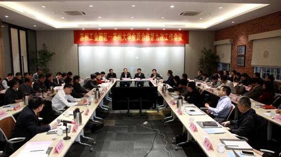 为进一步加强苏州工业园区和苏州大学的合作,落实名城名校战略,1月9日下午,苏州工业园区—苏州大学全面合作第九次工作会议在独墅湖校区金螳螂建筑学院会议中心召开。苏州市委常委、园区工委书记徐惠民,园区工委副书记、管委会主任杨知评,苏州市卫生与计划生育委员会主任谭伟良,教育局副局长黄锡明,人力资源和社会保障局副局长吴友良,园区工委、管委会相关领导及有关部委办局的负责同志,独墅湖科教创新区管委会领导;我校党政领导王卓君、熊思东、袁银男、路建美、田晓明、陈一星、江作军、杨一心、蒋星红、陈卫昌,以及学校相关职能部门、学院(部)、直属附属医院主要负责人出席了会议。会议由王卓君、徐惠民共同主持。