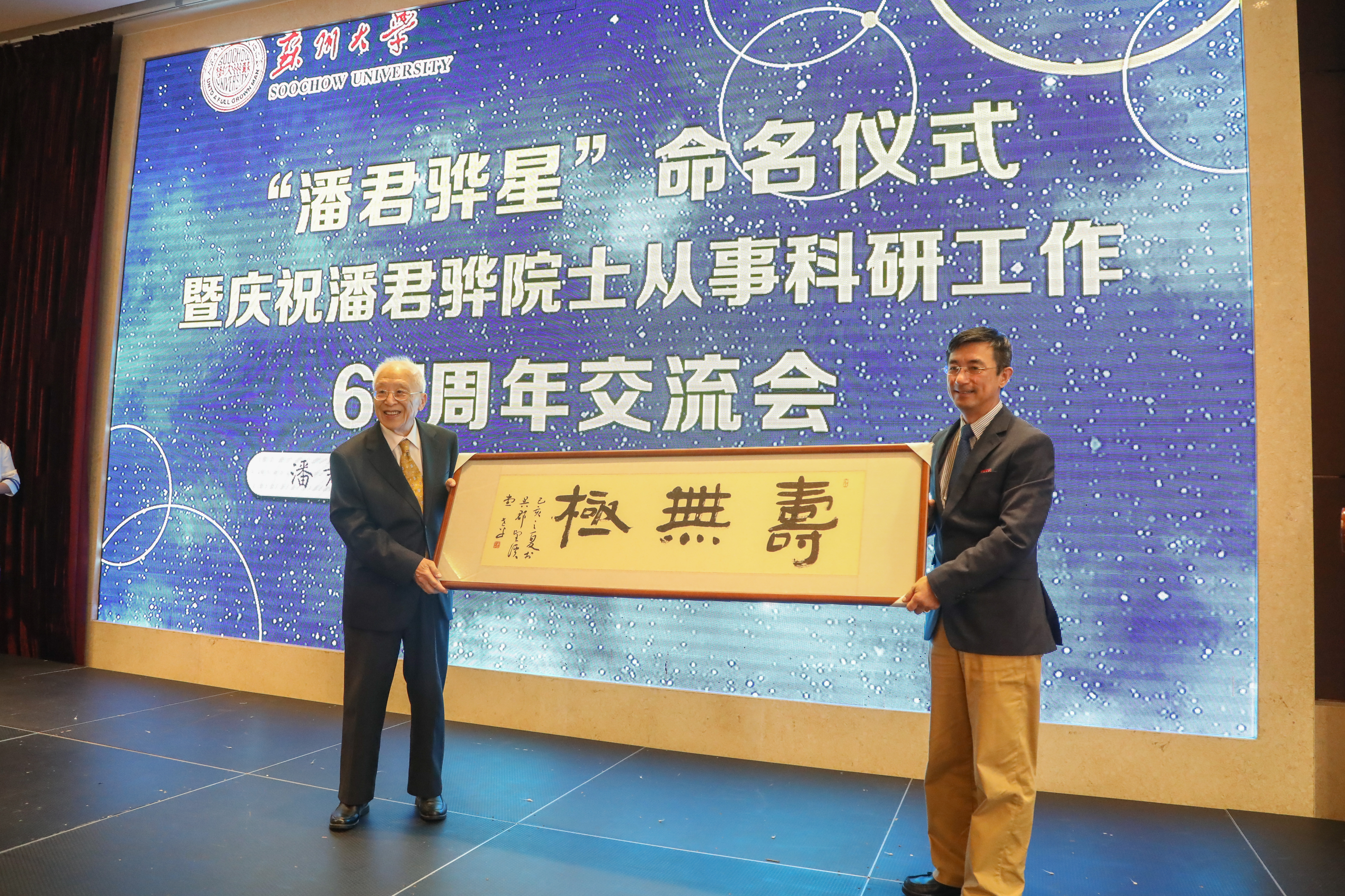 在热烈的掌声中,吴雪峰向潘君骅院士颁授“潘君骅星”命名证书,并颁授命名铜匾。杨捷兴向潘院士赠送“潘君骅星”命名公报。汪琦向潘院士赠送“潘君骅星”照片。赵海斌向潘院士赠送“潘君骅星”演示光盘。
