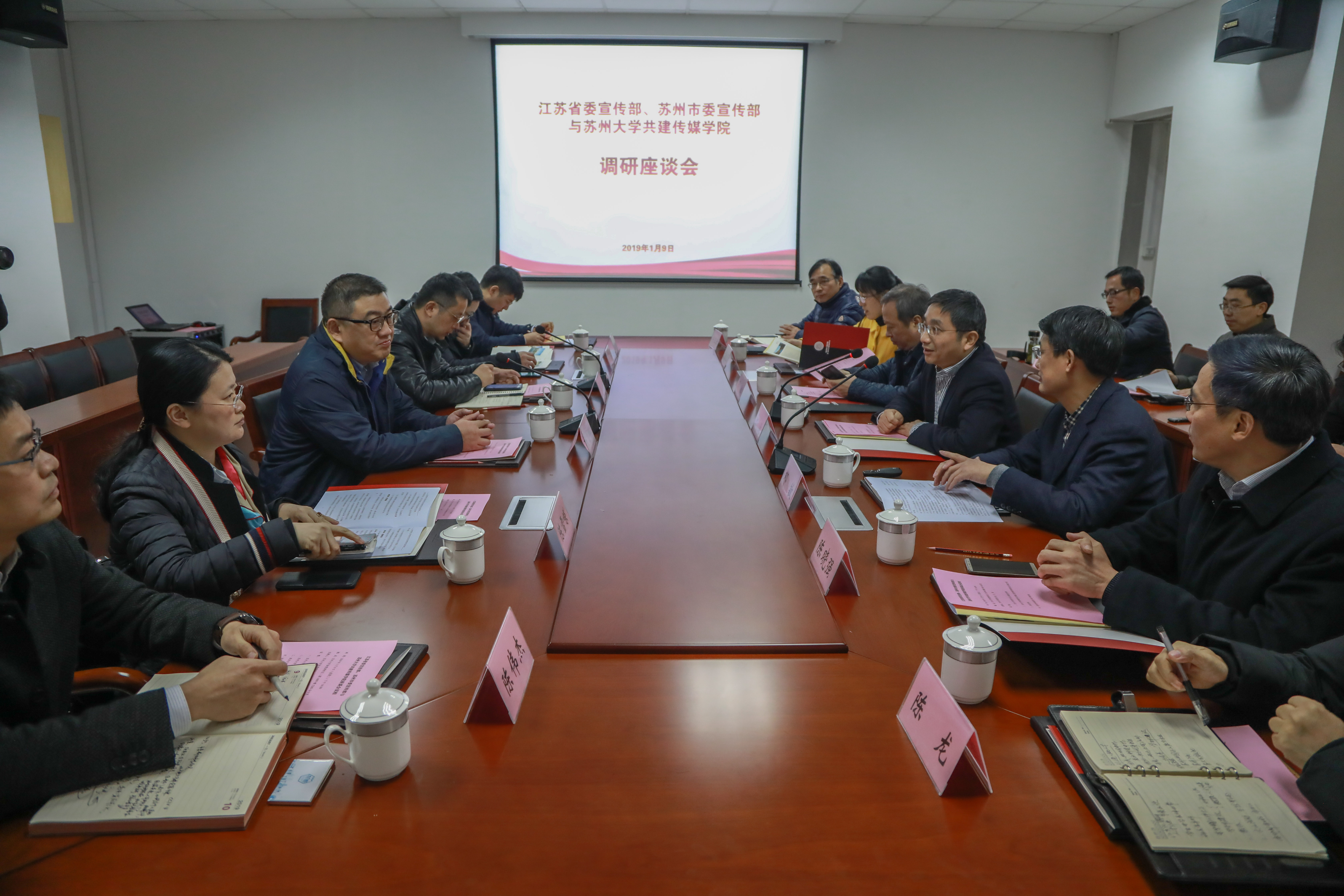 1月9日下午,江苏省委宣传部、苏州市委宣传部与苏州大学共建传媒学院调研座谈会在独墅湖校区召开。省委宣传部副部长杨力群、省委宣传部新闻出版处处长尤健,市委宣传部副部长、市委网信办主任陈雪嵘,市委宣传部外宣办副主任陈伟杰,市委宣传部新闻出版处处长奚松,我校党委书记江涌、党委副书记邓敏,以及党委办公室、党委宣传部、人文社会科学处和传媒学院主要领导出席会议。会议由江涌书记主持。