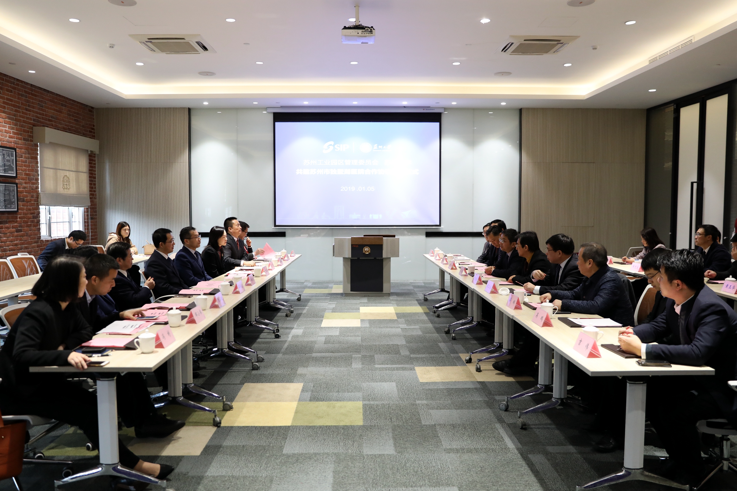 签约仪式前,双方围绕苏州市独墅湖医院(苏州大学附属独墅湖医院)的建设工作进行了简要会谈。