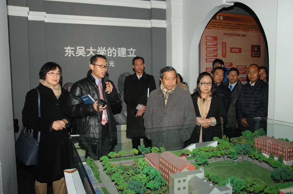 会后,在副校长蒋星红、校级调研员夏东民的陪同下,老挝科技部长Boviengkham VONGDARA一行,饶有兴趣地参观了天赐庄校区东吴大学旧址、校博物馆和独墅湖校区,走访了物理与光电·能源学部实验室、苏州纳米科技协同创新中心、现代丝绸国家工程实验室以及苏大维格光电股份有限公司。参观过程中,Boviengkham VONGDARA部长特别针对纳米协同创新中心和现代丝绸国家工程实验室的科研项目进行了详细询问,并在新能源材料、天然彩色茧家蚕新品种选育、高效养蚕模式和技术等方面听取了详细汇报。他希望,根据老挝国家发展需求,尽快推动我校与老挝科技部在高层次人才培养、科学研究、产业创新和转型升级等方面的合作。