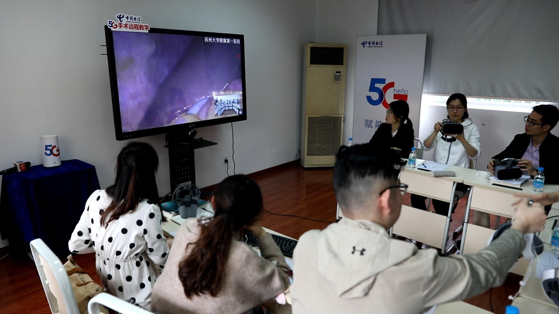 活动开始前,与会嘉宾在360教室体验了基于5G校园的医学教学课程。来自苏大医学部临床医学专业的同学们结合临床上一名腹痛患者的实际案例,围绕患者病史、急腹症病因及主要鉴别诊断等问题展开探讨。教学课程引入5G和VR技术,配合华为CloudLink和VR眼镜,进行手术远程直播教学。