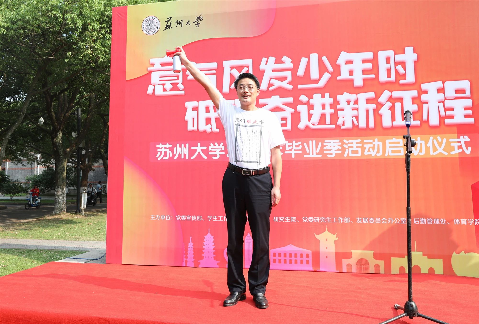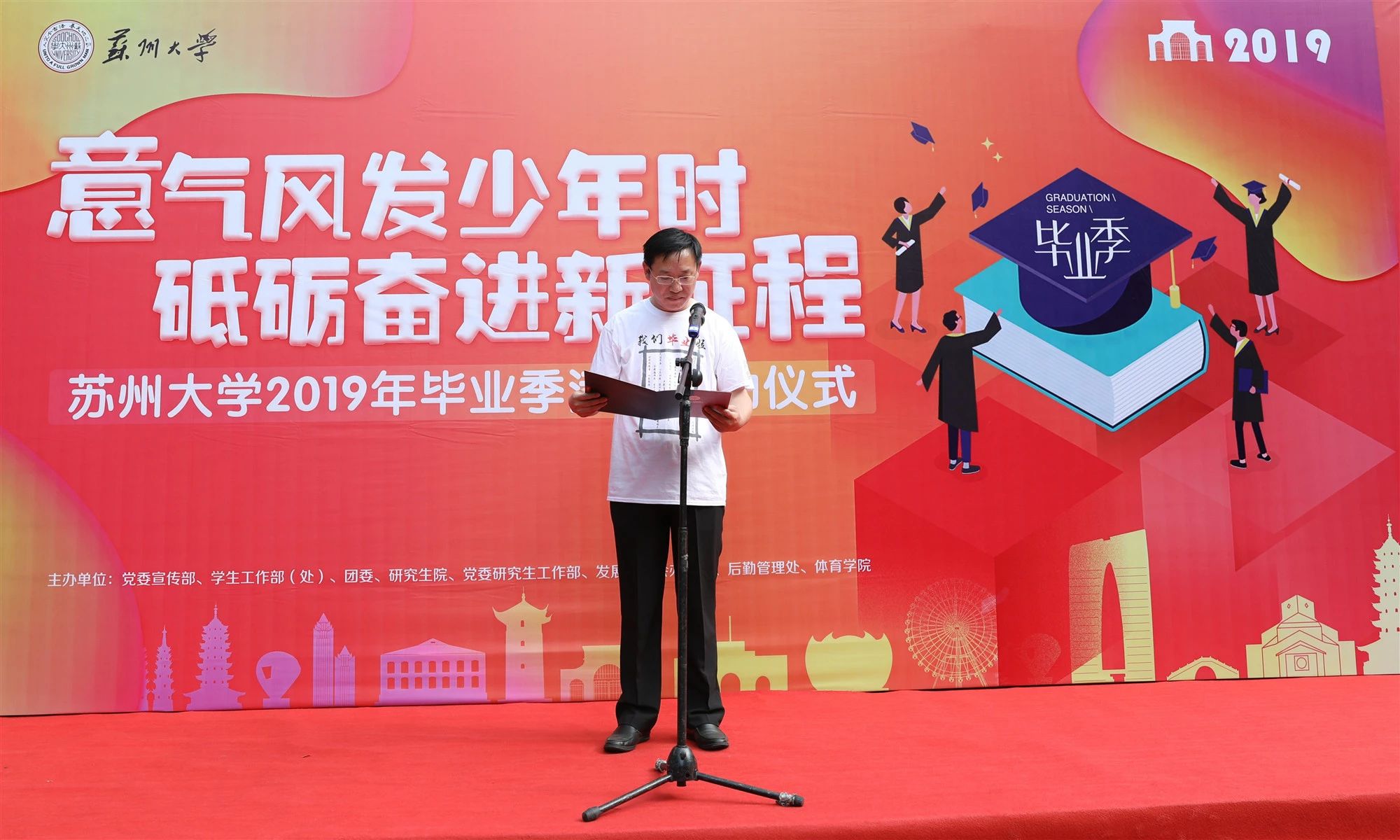 邓敏宣布苏州大学2019年毕业季活动正式启动,并为毕业生校园欢乐跑鸣笛开跑。毕业生们在奔跑中再一次感受苏大校园的文化与魅力,定格青春,跑向未来,共同追忆昔日校园的青春岁月,奋力跑向人生新的旅程。