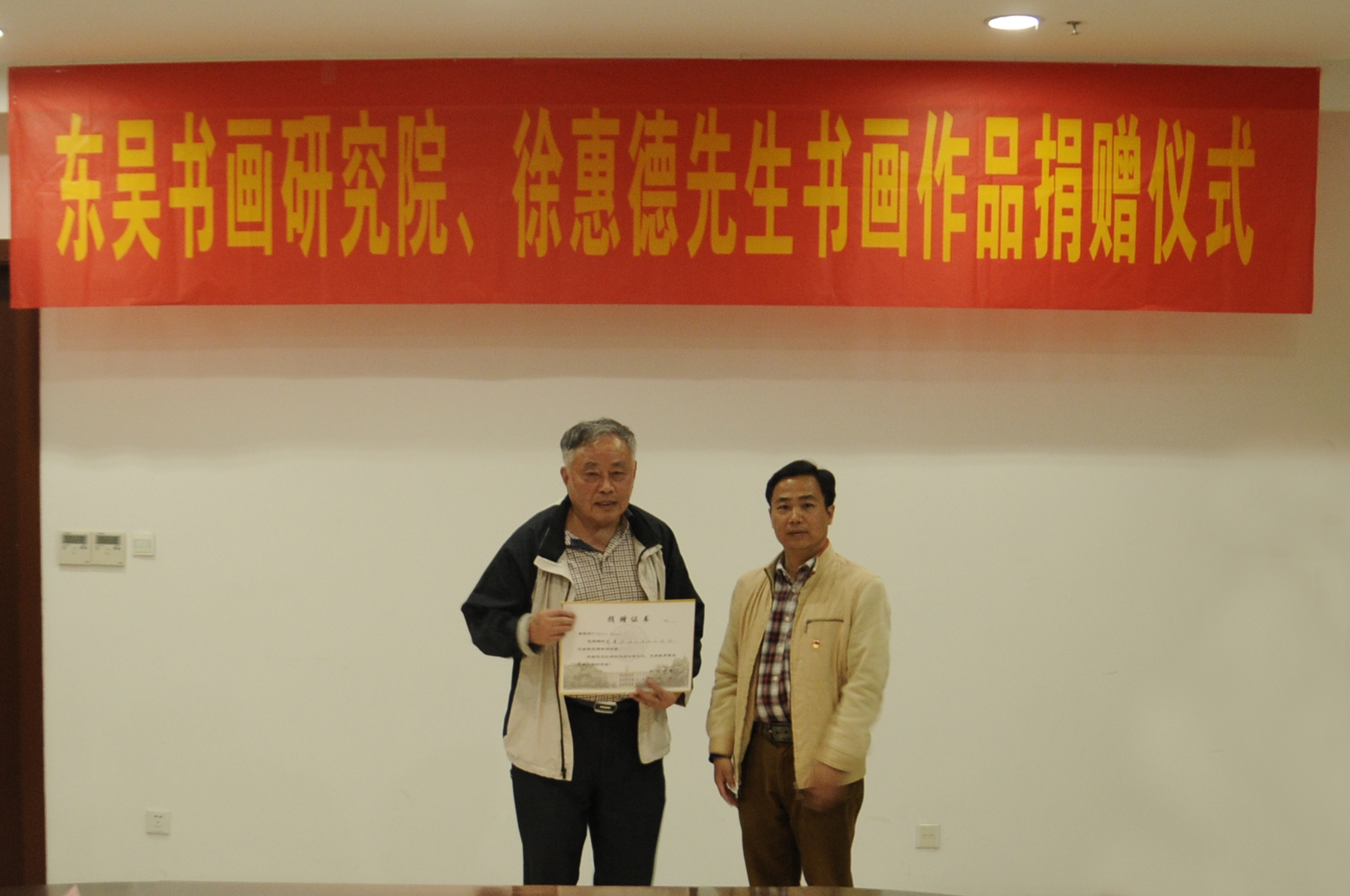 华人德先生代表东吴书画研究院(书画协会)向校博物馆捐赠书画作品共计255件,包括32件书画精品、44件书画轴和179件书画协会代表作品。书画精品中,含有书法名家祝嘉所做《傅山“四宁四毋”论书》条幅、苏州市第一任书协主席钱太初所做《和陈雅初见惠之作韵》横幅、我校校友杜重划所做《南国风情》国画、我校国学大师钱仲联所做《范仲淹词渔家傲》条幅及袁贤群、瞿冕良、夏淡人、张珂、李鹤云、缪华伦、高迈之、姜振镛等书画协会老一辈名家的力作。