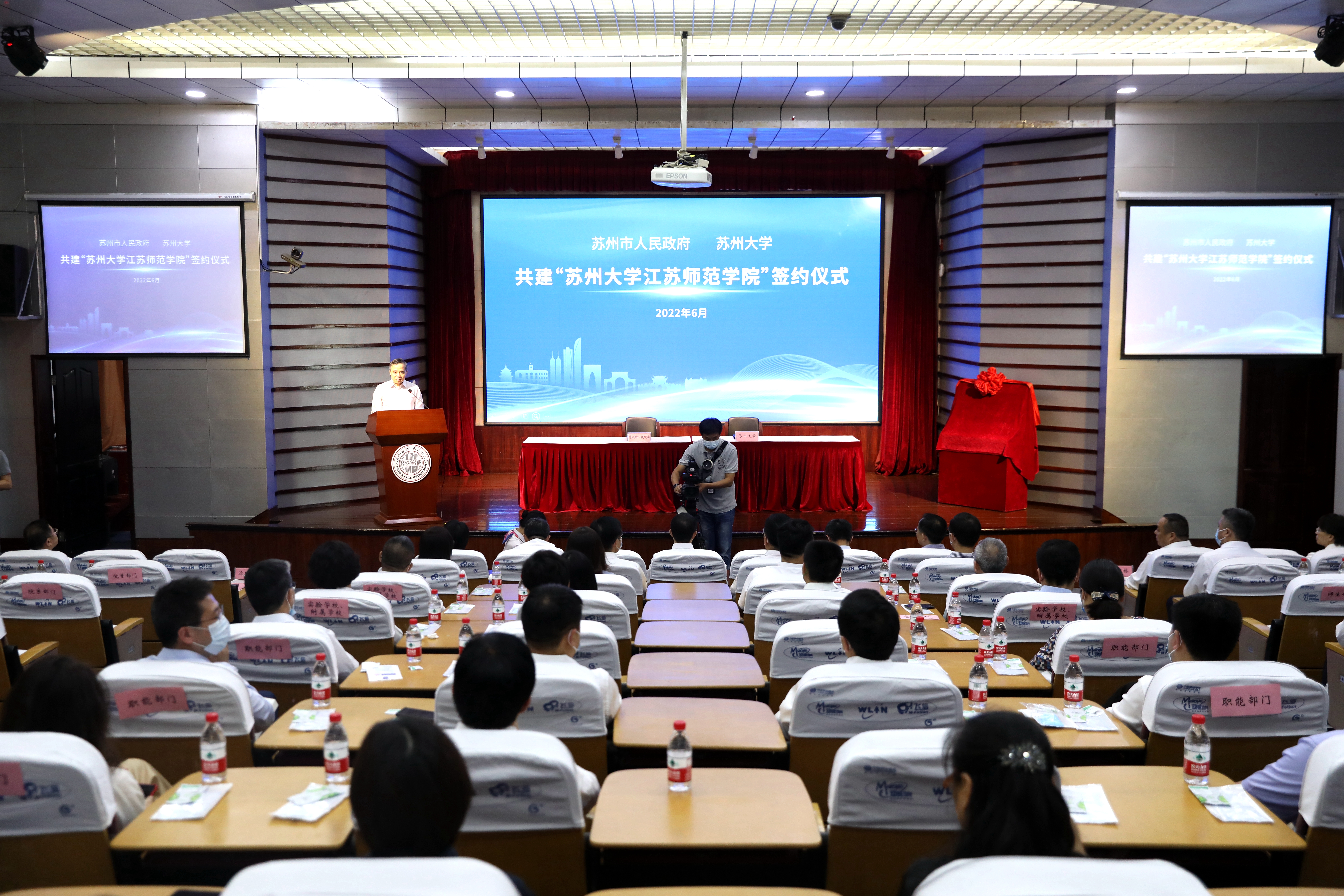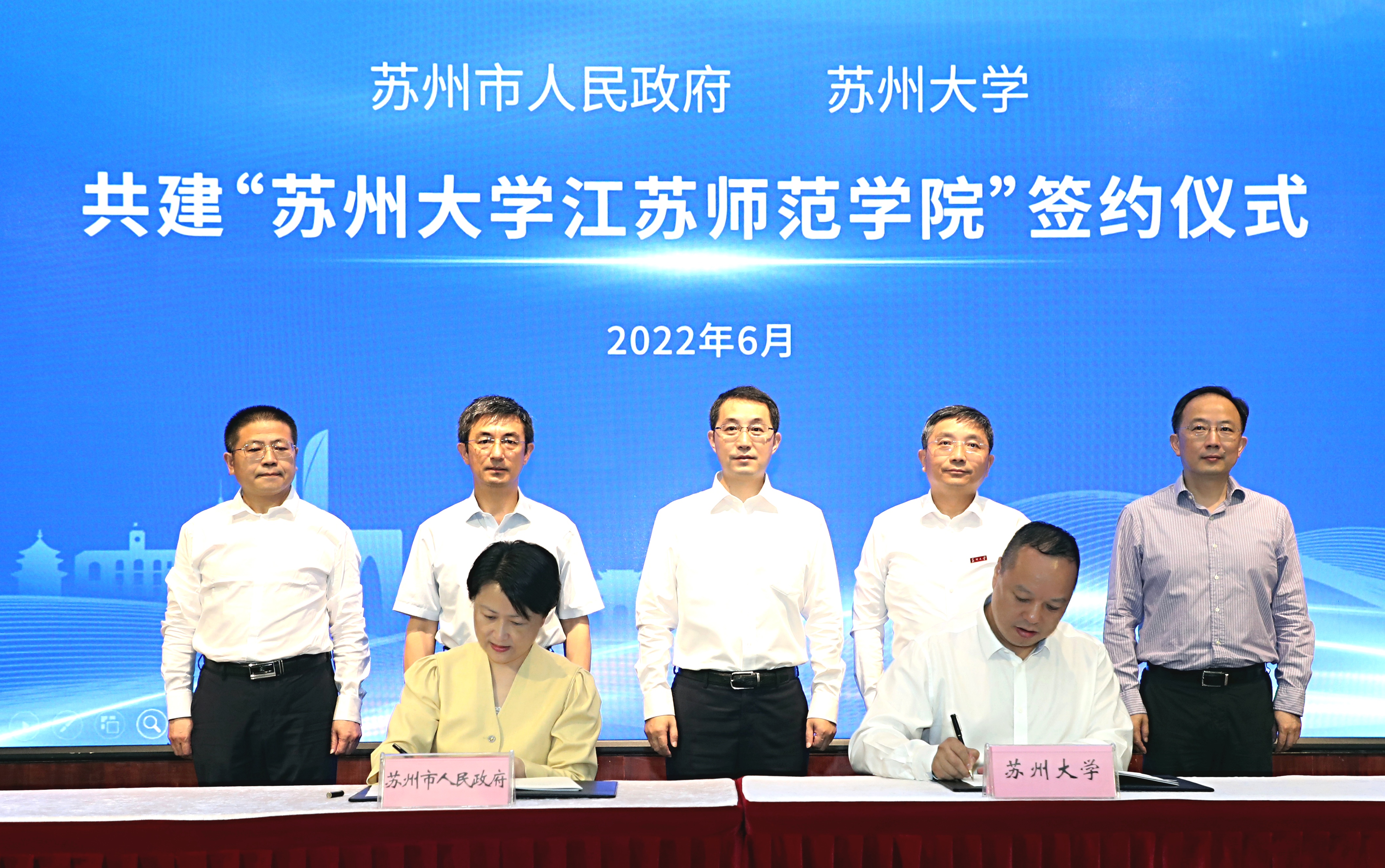 6月26日,苏州市人民政府与苏州大学共建“苏州大学江苏师范学院”的签约仪式在红楼会议中心学术报告厅举行。教育部教师工作司司长任友群,苏州市委副书记、市长吴庆文,苏州市副市长季晶,苏州市政府秘书长陈羔,苏州市政府副秘书长谢飞 ,苏州市教育局局长周志芳,苏州市财政局局长刘小玫,苏州幼儿师范高等专科学校校长杨建良,我校党委书记江涌、校长熊思东,校党委常委、副校长沈明荣、姚建林等出席活动。苏州市教育局相关部门负责人,我校相关职能部门负责人、相关学院领导和师生代表,以及苏州大学实验学校和附属学校的领导参加了签约仪式。仪式由副校长沈明荣主持。