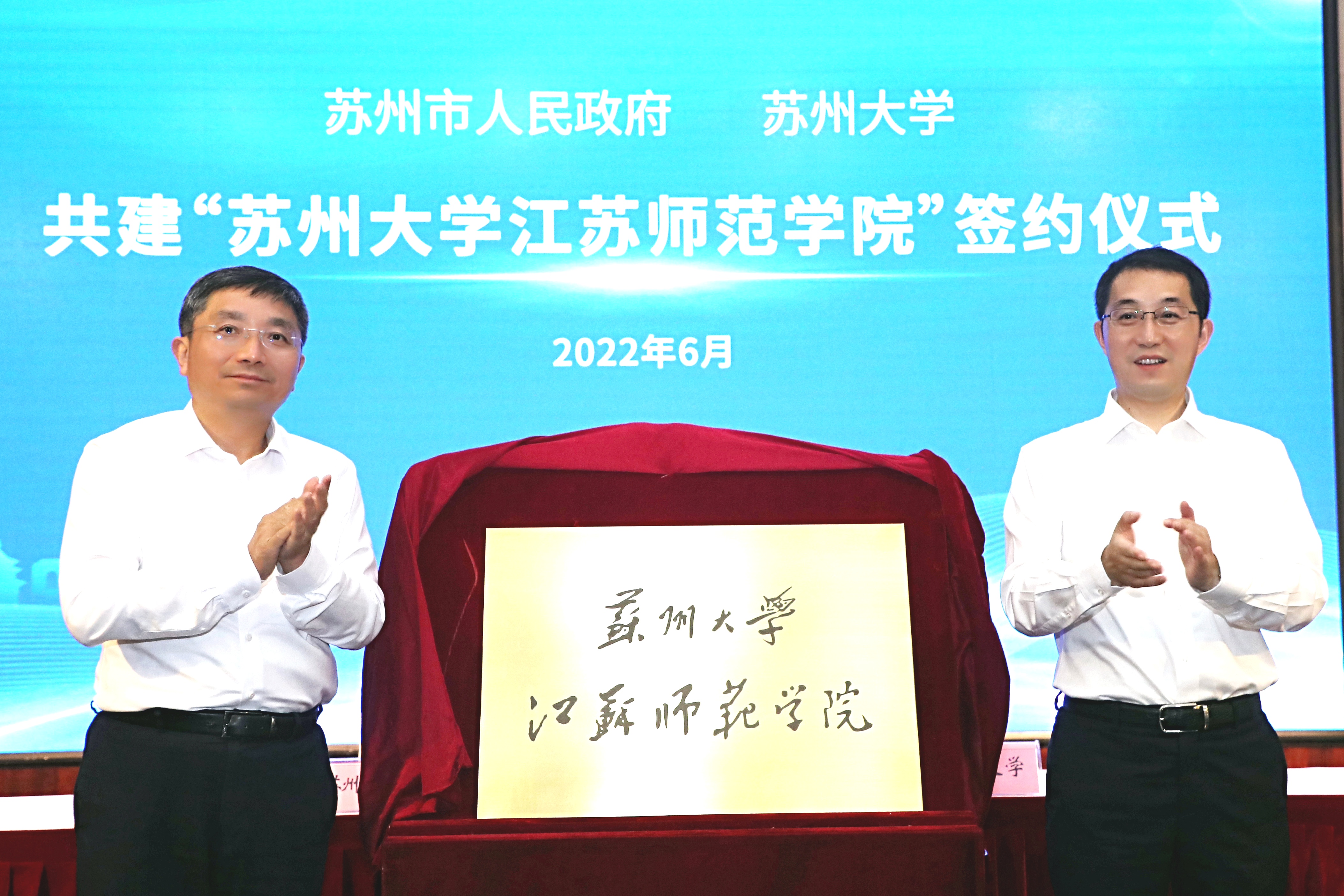 吴庆文市长在讲话时表示,近年来苏州深入贯彻习近平总书记关于教育重要论述,认真落实中央和省的决策部署,始终把教育事业放在优先发展的战略位置,高度重视在苏州的高校发展,逐步形成了“名城带名校、名校促名城”的融合发展格局。苏州大学江苏师范学院是推进校地合作,继承弘扬“江苏师范学院”优良教育传统,共促苏州教育高质量发展的又一关键性举措,对于苏州师范教育内涵式发展具有里程碑的意义。苏州市将全方位支持苏州大学师范教育改革探索,继续加强校地师资供需对接,为苏州基础教育发展储备更多优秀师资;充分发挥苏州大学师范教育龙头带动作用,优化教育资源配置,释放教育资源活力;切实发挥高水平大学科研优势,打造服务苏州教育发展的“智库中心”,推进师范教育创新研究,构建校地深度融合的师范教育发展新格局。