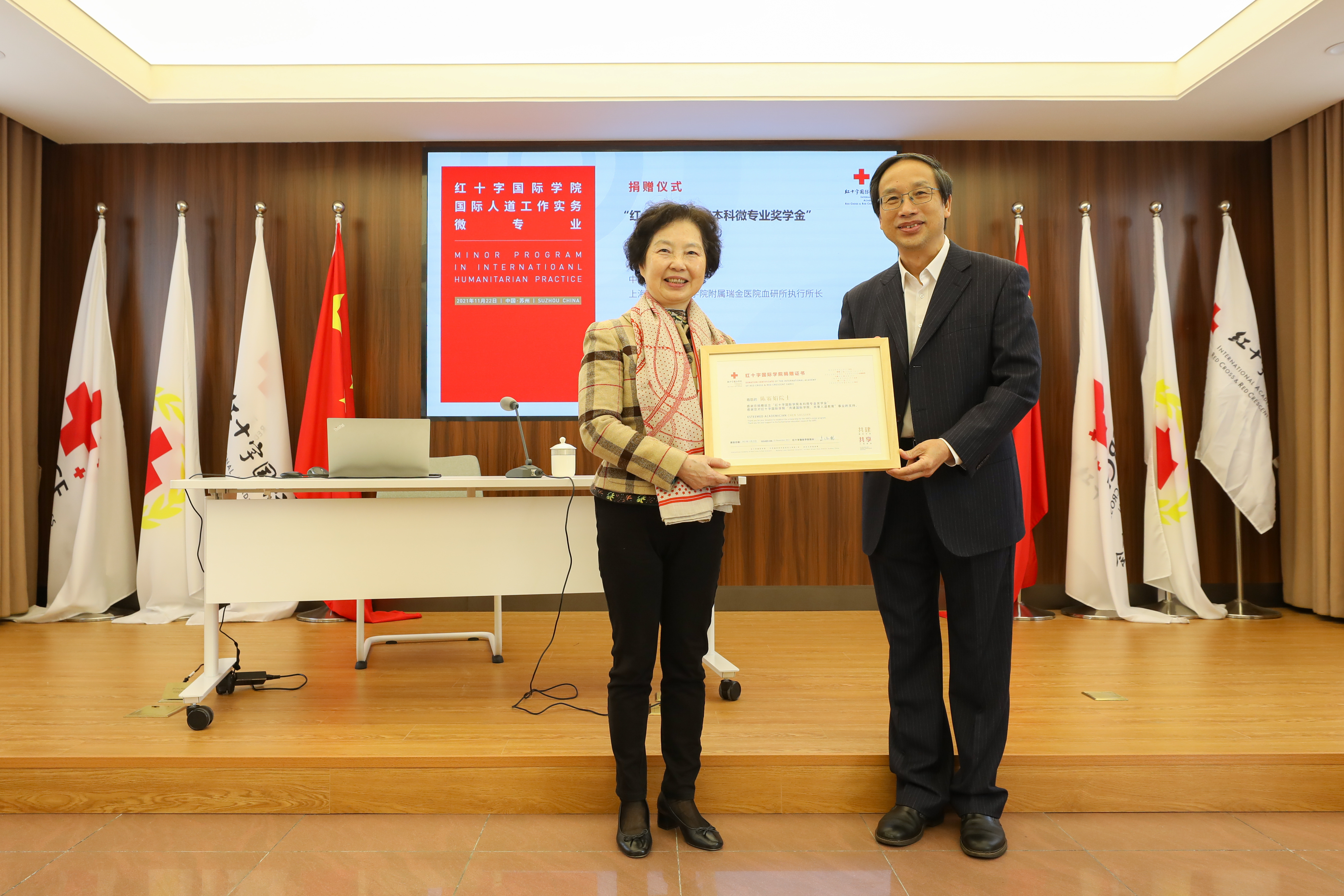 据悉,中国工程院院士、上海交通大学医学院附属瑞金医院血研所执行院长陈赛娟出席了当天的授课活动,并捐资设立红十字国际学院本科微专业奖学金,以助力学院人才培养工作。红十字国际学院院长王汝鹏为陈赛娟院士颁发捐赠证书。