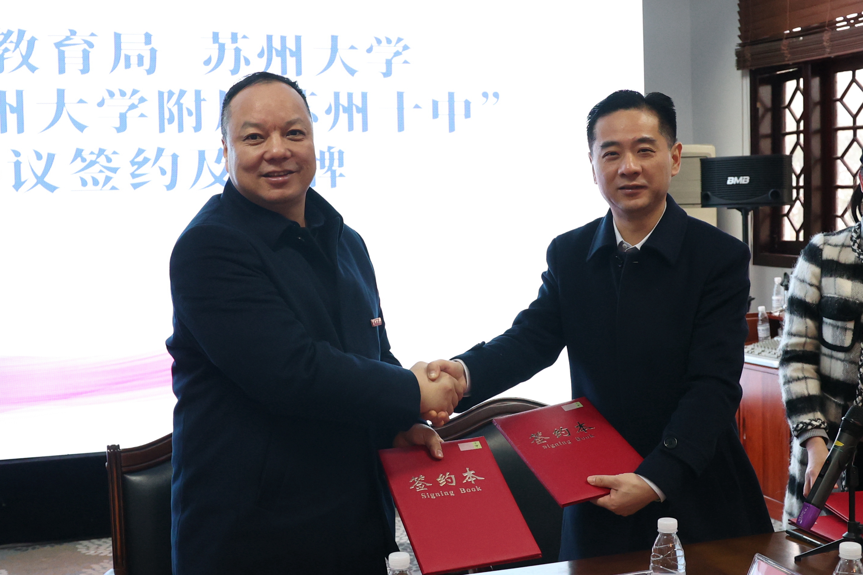 周志芳局长与沈明荣副校长共同签署苏州市教育局与苏州大学教育合作协议。