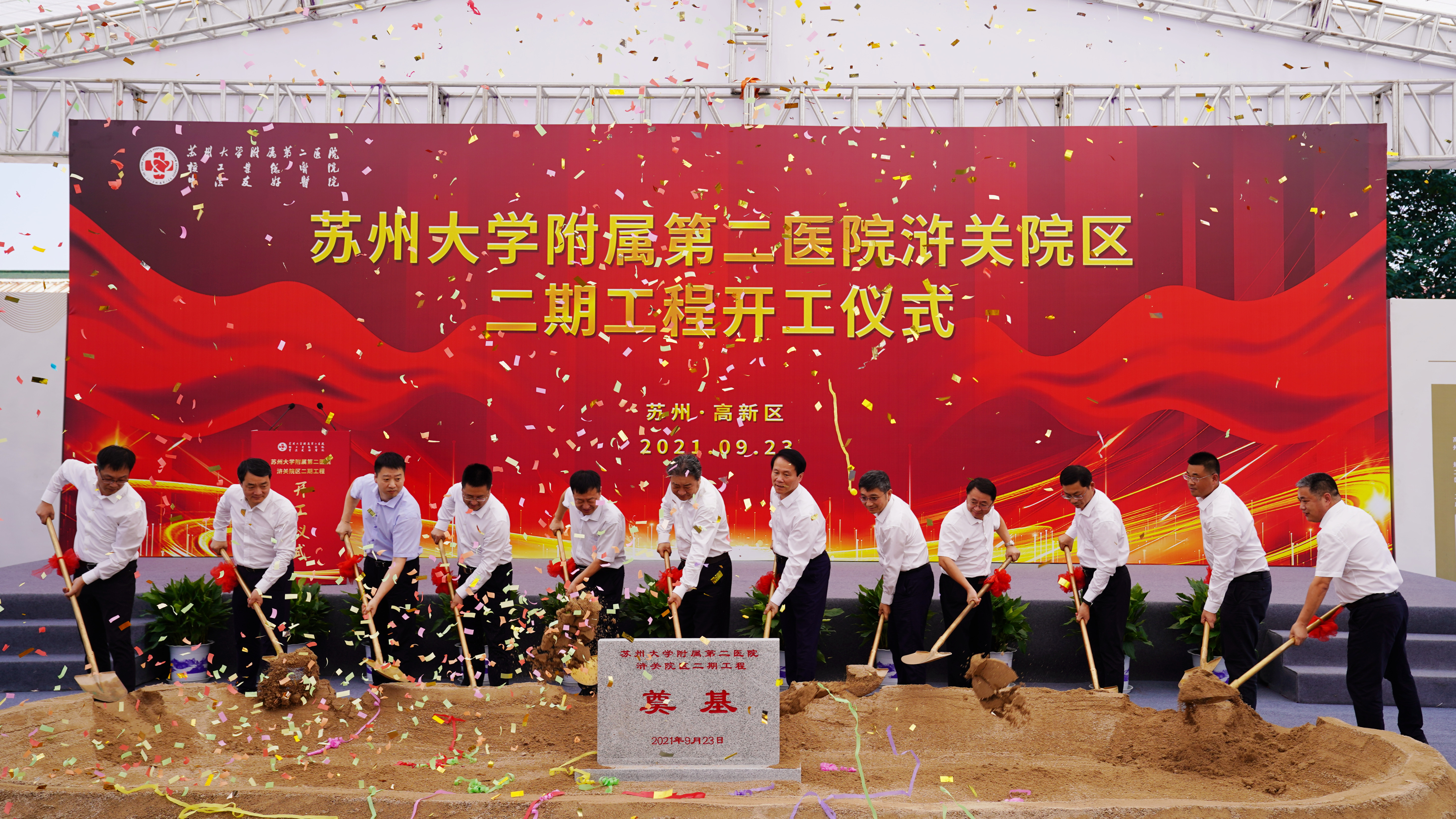 9月23日,苏州大学附属第二医院浒关院区二期项目开工奠基。苏州市副市长曹后灵,苏州市卫健委主任盛乐,苏州高新区党工委书记毛伟,苏州大学党委书记江涌,中核集团总经理助理孟琰彬,詹启敏院士、苏大附二院全体领导班子出席仪式并见证开工奠基。