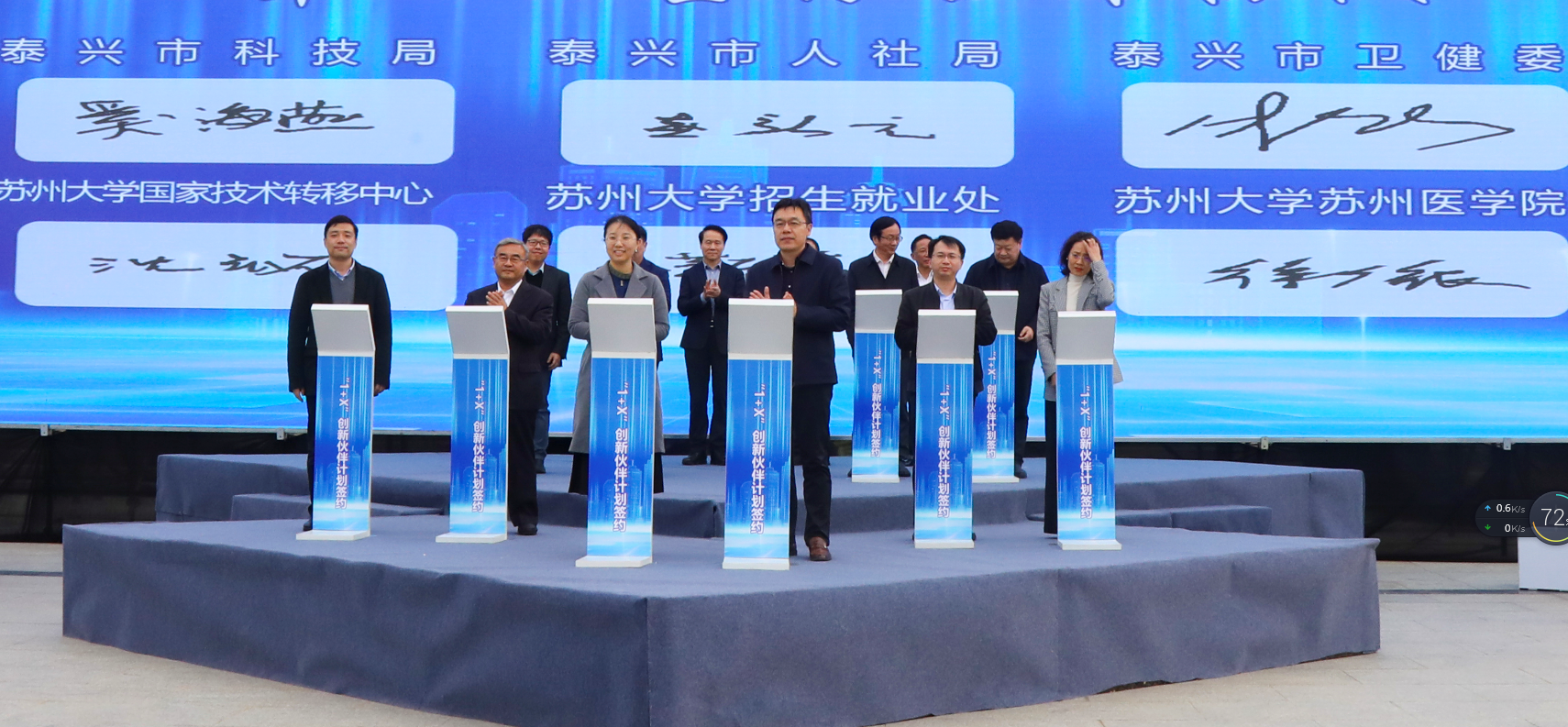 在我校党委副书记王鲁沛、苏州医学院院长詹启敏院士的见证下,国内合作发展处、师范学院、国家技术转移中心、招生就业处、苏州医学院、先进技术处、柴之芳院士团队与泰兴市委人才办、教育局、科技局、人社局、卫健委、城区工业园区、经济开发区共同签署合作协议。