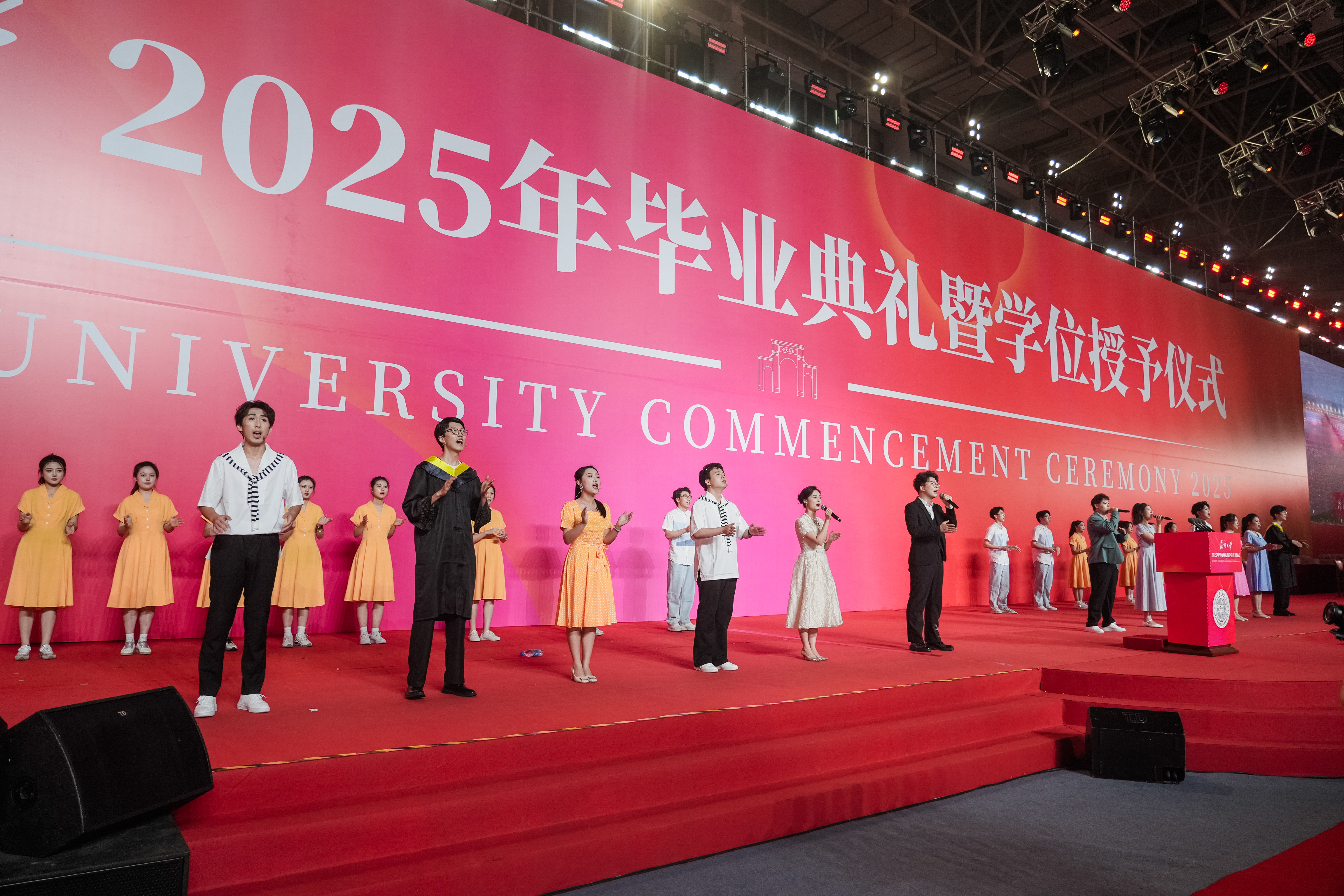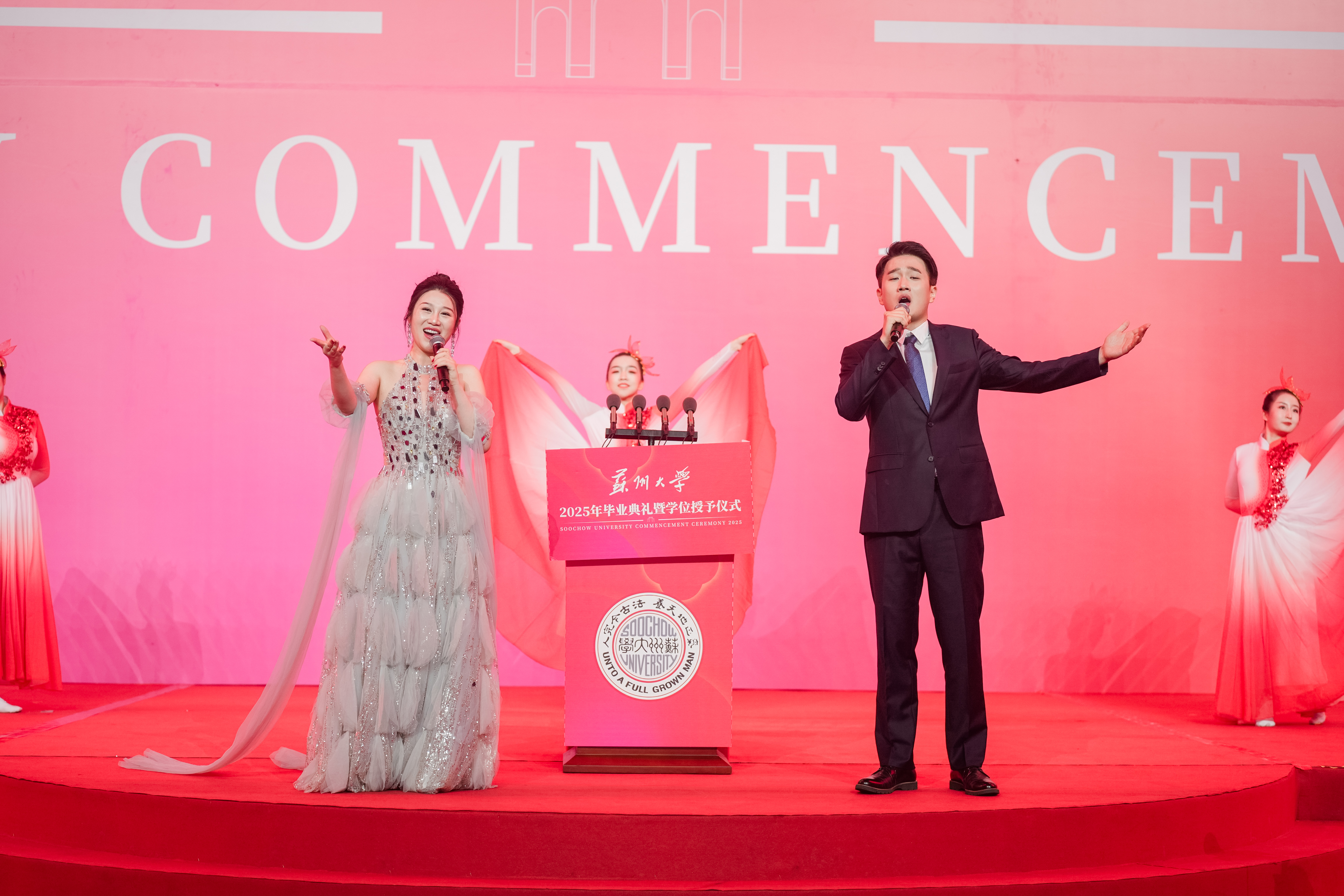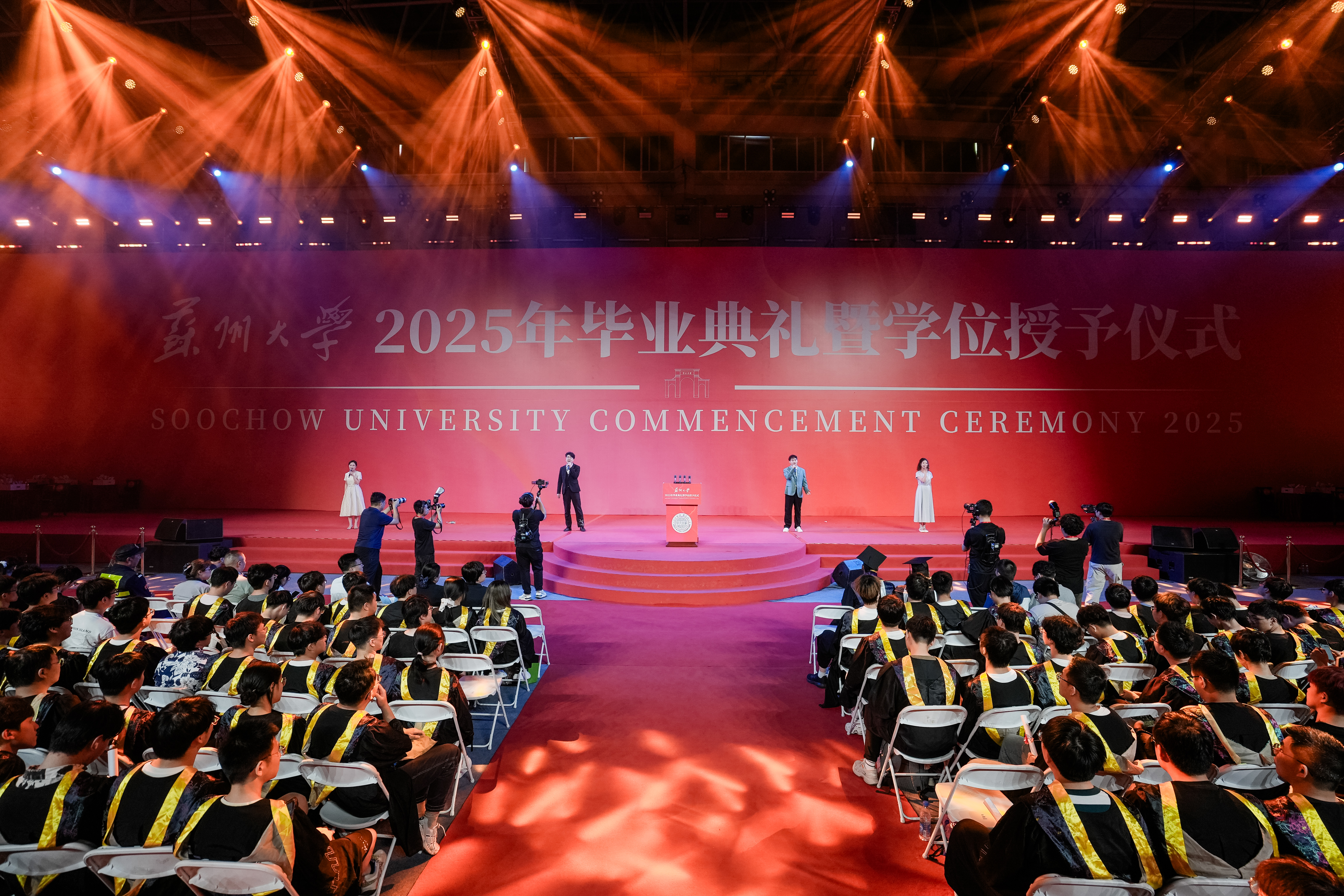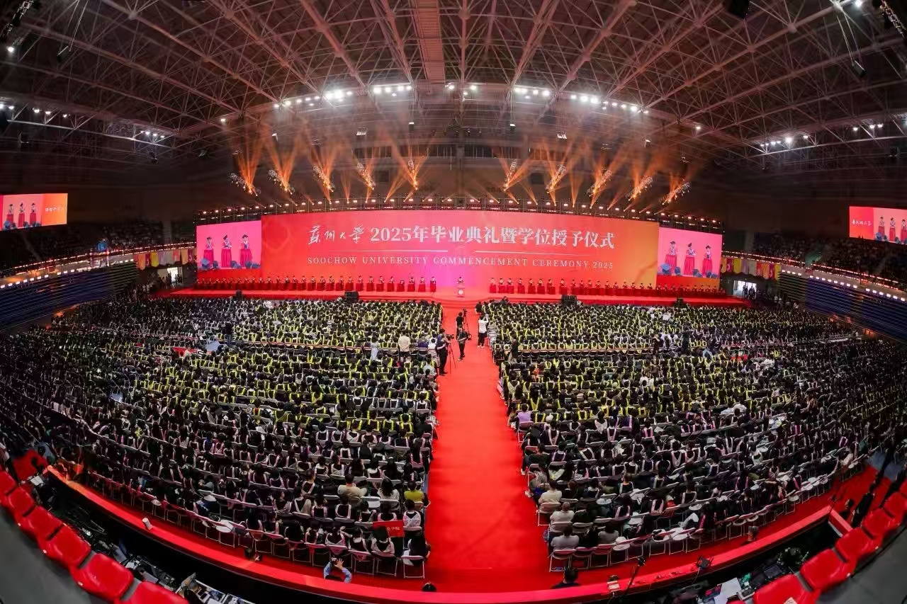 伴随着热烈的掌声,苏州大学2025年毕业典礼暨学位授予仪式礼成。梦想远行,奔赴山海,一首《飞得更高》饱含逐梦远方的壮志豪情,一首《送别》道不尽同学们对母校的眷恋。《歌唱祖国》的旋律响起,全场师生齐声高歌,青春热血与爱国情怀紧密交织,共同祝愿伟大祖国繁荣昌盛。