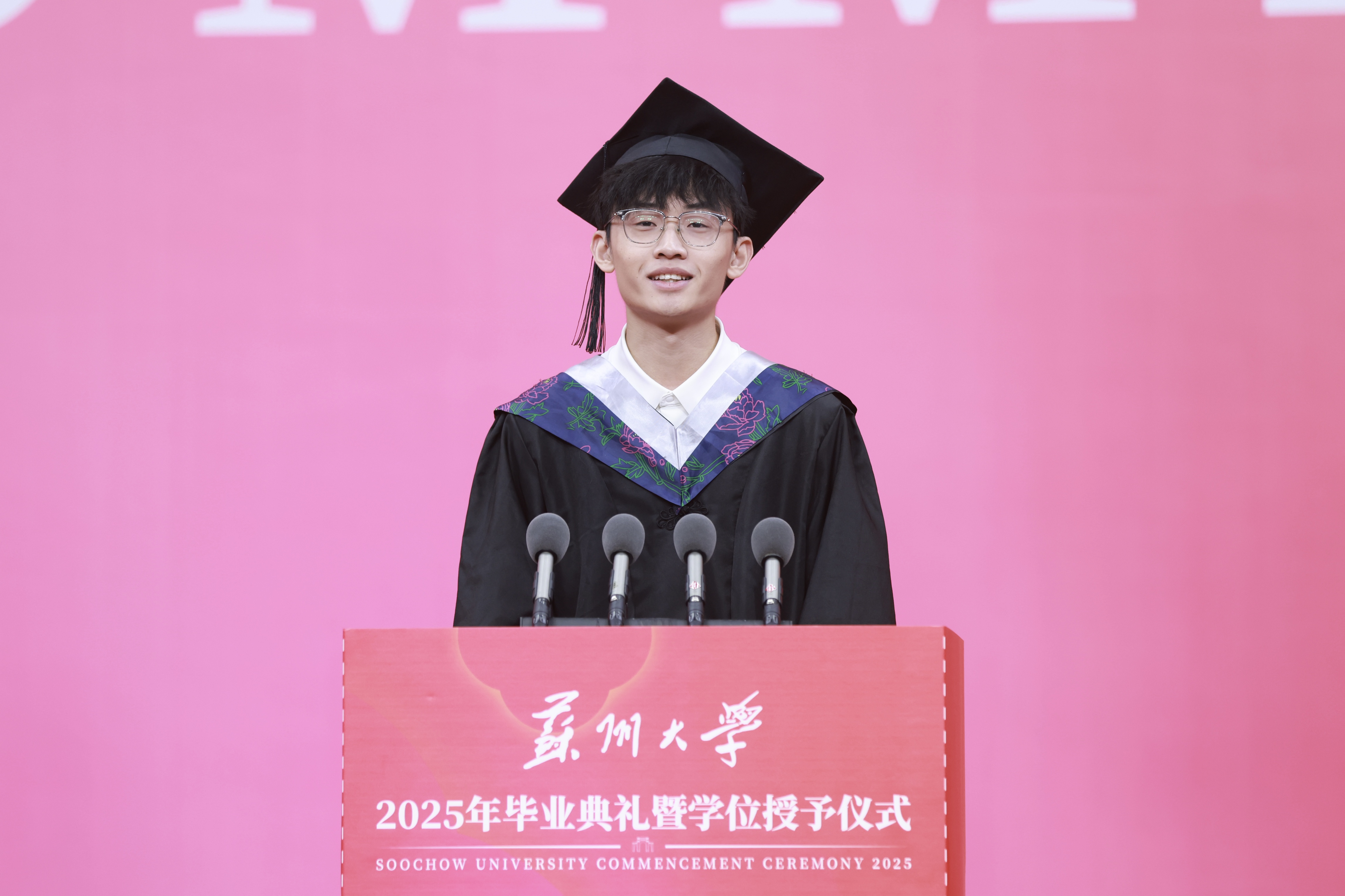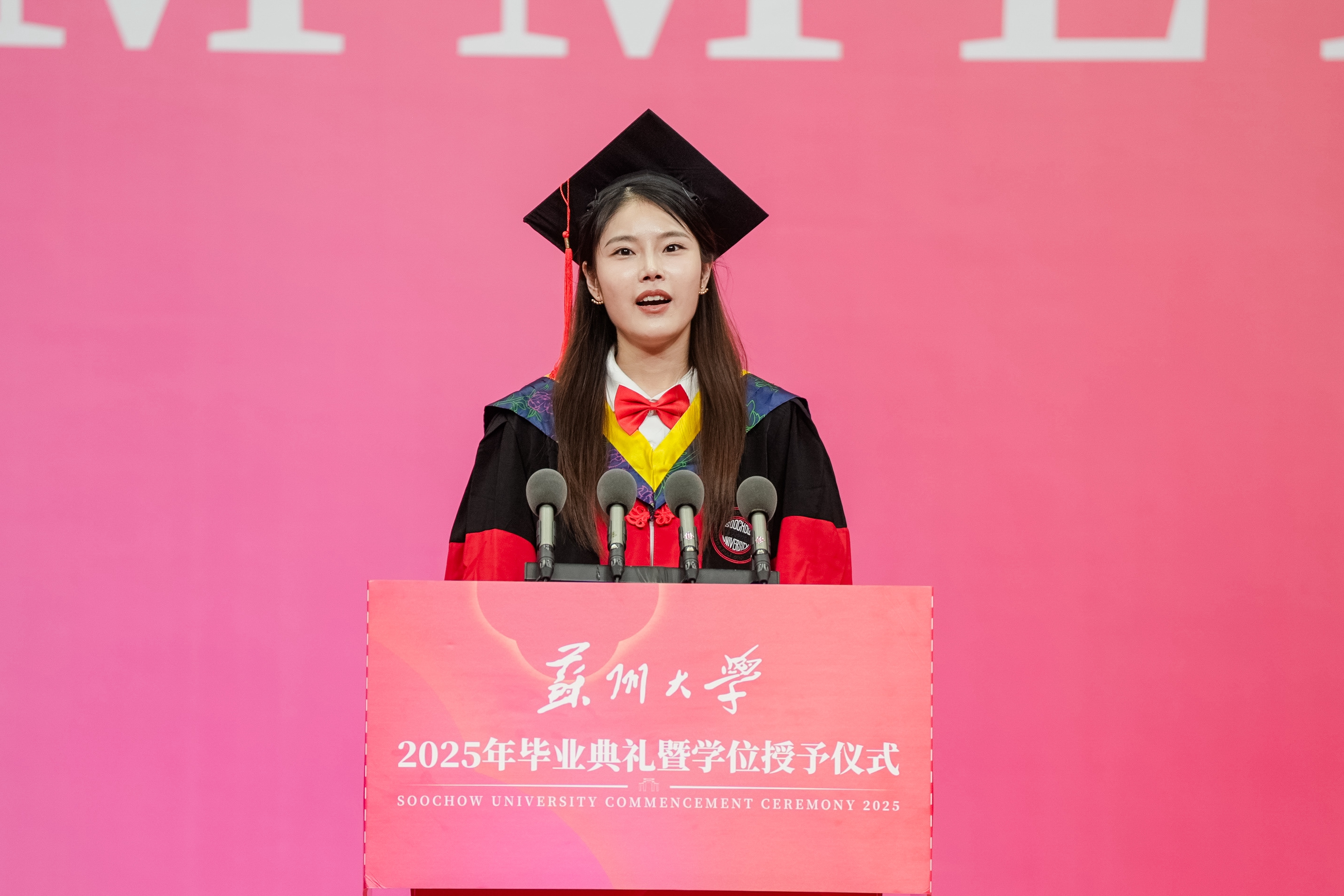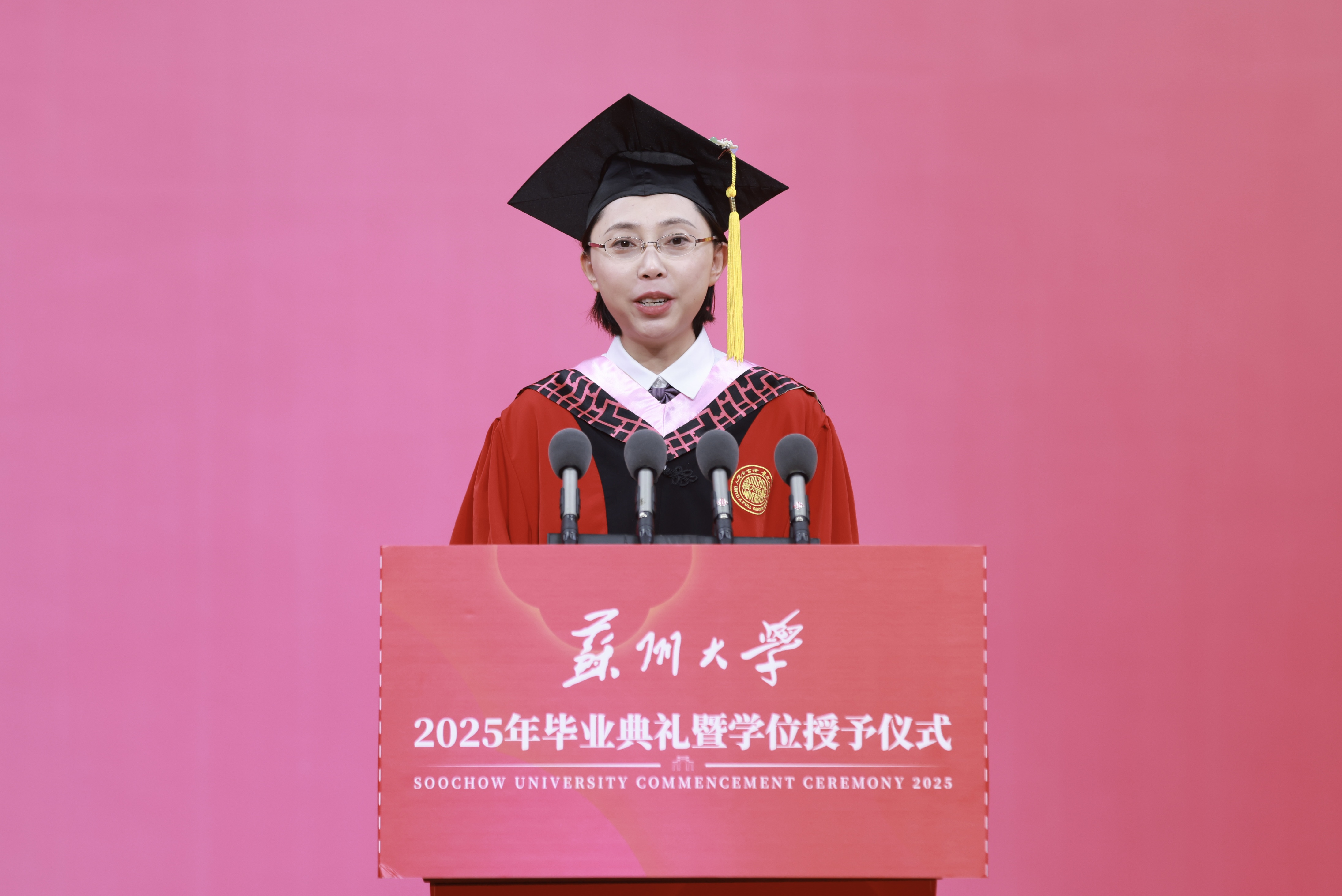 研究生代表、轨道交通学院博士周小淇,分享了她在苏大的九年时光里,走过的求学路、科研路以及践行路。她表示,定会带着母校的嘱托,在专业领域精耕细作,追求卓越,用实际行动书写无愧于时代的答卷。