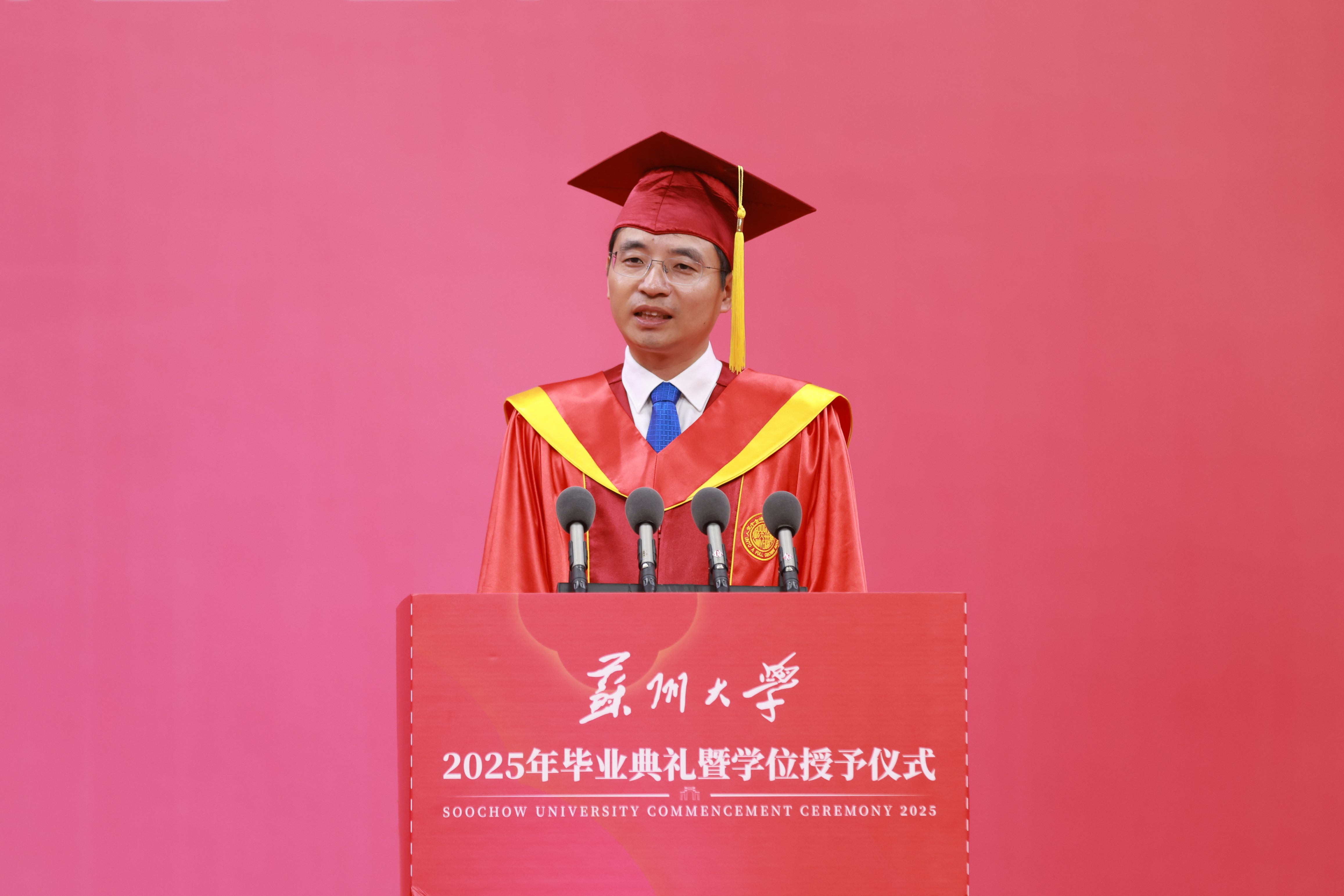 毕业典礼上,校长、校学位评定委员会主席张桥向圆满完成学业的毕业生们致以热烈祝贺和美好祝愿,并以《东吴撑篙起,万里逐梦去》为题,深情寄语学子以“理想、创新、人文”为篙,在时代浪潮中勇敢前行。