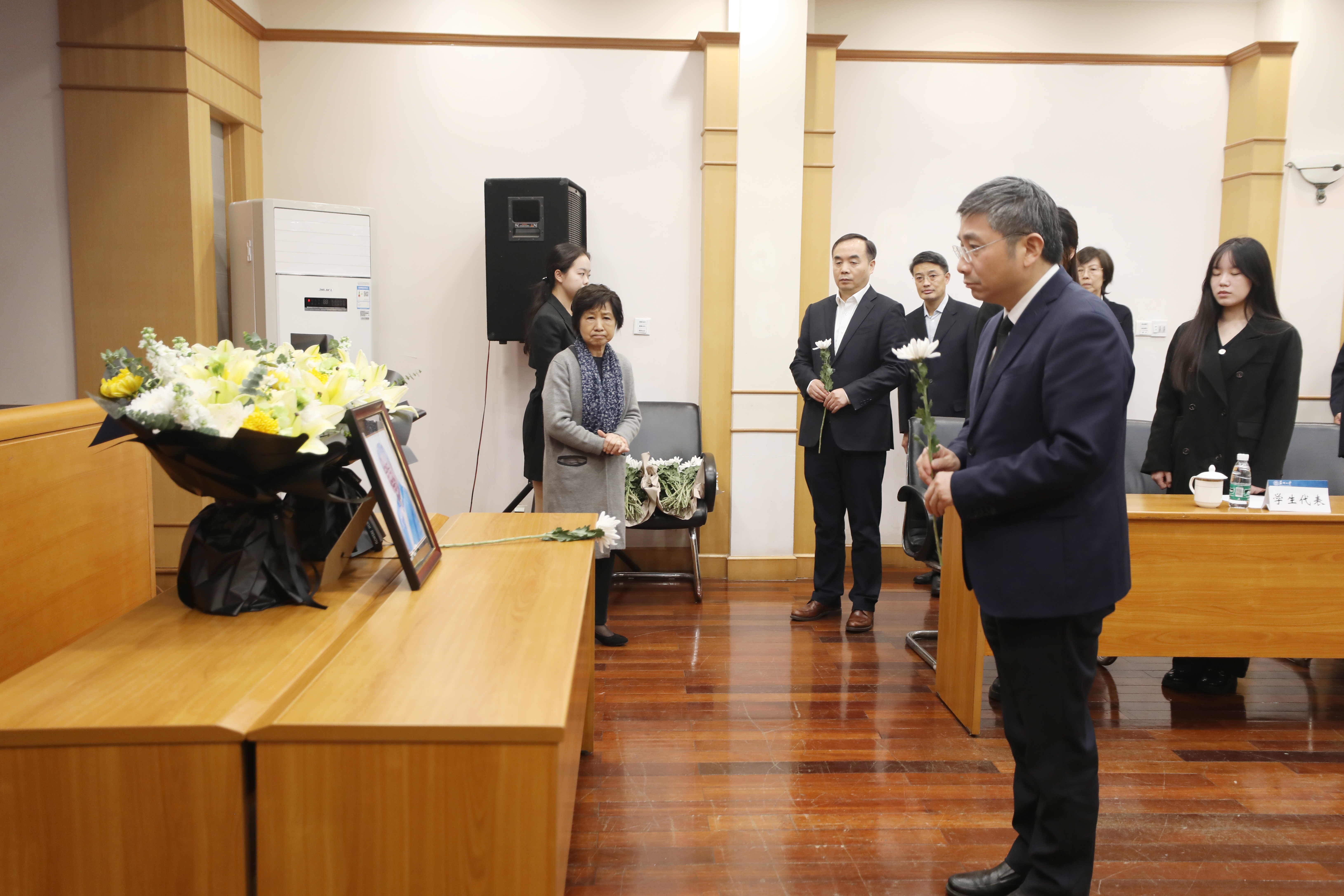 追思会开始前,全体肃立,向朱恩馀先生遗像默哀。与会师生依次向朱恩馀先生遗像敬献鲜花,一朵朵菊花寄托着苏大师生对朱先生的崇高敬意与深切哀思。