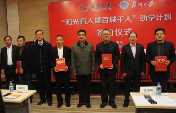 由东吴人寿保险股份有限公司与我校共同举办的东吴人寿—苏州大学“阳光育人暨百城千人”助学计划,将对我校家庭经济困难的优秀学子进行为期三年的持续关怀。除每年给予每名学生5000元助学金外,同时为每位受助学生配备一名导师和一名助理导师。导师均为来自苏州地区知名上市公司的董事长(总裁)或副董事长(副总裁),助理导师则由我校具有丰富学生工作经验的专职学生工作干部兼任。