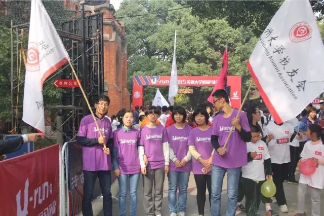 在今年的校园马拉松赛中,校友会特地选派了“苏州大学校友工作志愿者协会”的学生志愿者,为校友们提供了贴心周到的后勤服务工作和温馨细致的校友材料袋,并且还建立了参赛校友微信群,为校友们实时提供咨询服务。上午十一点多,便陆续有校友来到钟楼前草坪上的“校友、校董报到处”,他们在此登记校友信息、合影留念、感怀母校,并为接下来的马拉松比赛做准备。02广告的校友们还特地组团返校参加了此次活动。
