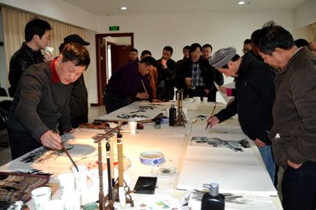 捐赠活动结束后,到场的书画艺术家及爱好者们参加了此次活动的艺术品鉴笔会环节。笔会现场,气氛热烈,书画艺术家们交流见解,切磋技艺;泼墨挥毫,同展高超艺术,短短四个小时之内创作了多达二十余幅书画作品。书法作品或个性张扬的行书,或法度严谨的甲骨,或自创奇趣的竹书,不一而足,各有千秋;绘画内容或曲径通幽的山水,或活灵活现的花鸟,或雍容典雅的人物,丰富多彩,目不暇接。