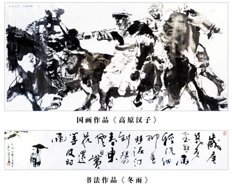 《高原汉子》是王文杰教授采用国画传统技艺“没骨法”而创作的水墨画,其特点在于不用墨笔立骨勾勒,直接作画。此幅《高原汉子》,画中豪迈的人物与嘶鸣着的骏马相互呼应,整个画面波澜壮阔,将高原汉子们粗犷朴实的形象与气质体现的一览无遗。《冬雨》则是王文杰教授在冬季的某个雨天,被眼前美景触动,即兴赋诗一首,并以雨中执伞的人物作为配画。其书法化境怡神,格调儒雅,其配画清新雅致,神韵盎然。两幅作品均具有较高的鉴赏与收藏价值。