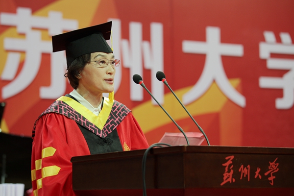 校学位评定委员会主席、校长熊思东教授向毕业生们致以最热烈的祝贺,向教职工表示最衷心的感谢,向家长亲友、社会各界人士表示最诚挚的敬意。熊校长用毕业生抽样调查数据讲述了毕业生们的成长与变化,带领着毕业生们一同回顾了丰富精彩的大学校园生活。在致辞中,他与大家分享了一份令他感动的毕业感言,并表示“成长的路上,苏大人一个都不能少”。