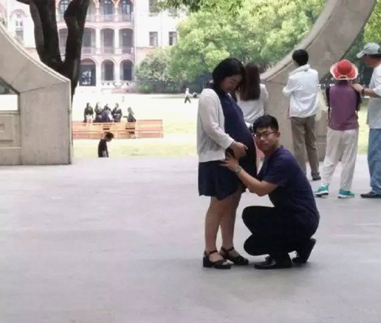 他们的故事:“我们两个不是同班,她当年可是班里唯一的女生,没有被内部消化,被我追来啦!现在她怀孕,我也跟着吃的胖了起来~我们两个人现在都在苏州工作,时不时的还会逛到北校区,情人坡,再去后庄溜溜弯,还是熟悉的感觉。”小宝宝预计8月份就要出生啦,我们期待这个小小苏二代哦~今天两个人回到母校两人特意穿了情侣衫,一路上男方一直注意搀扶着女方,牵手,互相擦汗,十分幸福甜蜜。