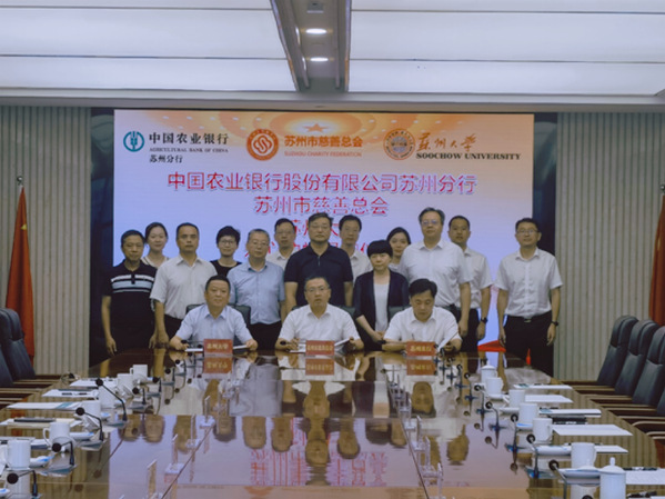 随后,苏州市慈善总会、中国农业银行股份有限公司苏州分行、苏州大学三方代表共同签署了爱心助学捐赠协议,并就后续合作进行了简要交流。