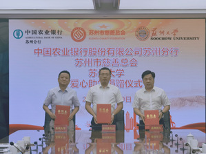 中国农业银行股份有限公司苏州分行长期关注教育和慈善事业,帮扶经济困难的优秀学生,推动慈善文化进校园。中国农业银行股份有限公司苏州分行本次通过苏州市慈善总会向苏州大学教育发展基金会捐赠人民币100万元,定向用于苏州大学困难学生的助学项目,鼓励学生刻苦学习、成为优秀人才。