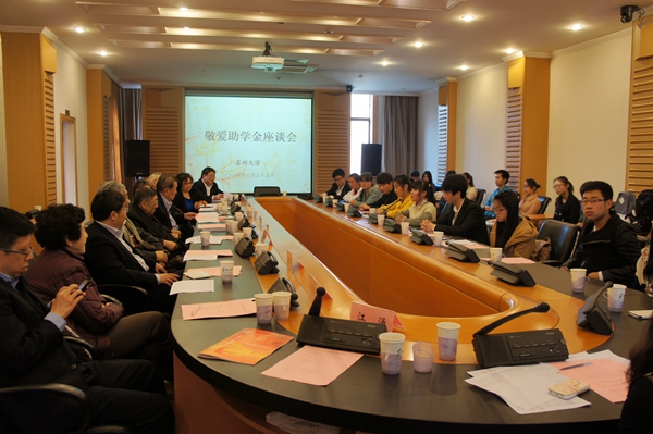 3月25日下午,2014年敬爱助学金座谈会在我校红楼217举行,到场的有朱敬文教育基金会成员,朱敬文教育基金会大陆地区代表、原校长陈克潜及陆忠娥夫妇,校党委副书记、副校长江涌,学生工作部(处)相关工作人员和获助同学代表。