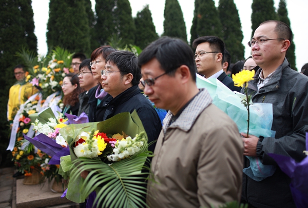 我校师生代表分别向朱敬文、杨畹珍夫妇和朱婵英女士墓敬献鲜花,表达哀思。之后,敬文书院张立春同学代表全体学生发言,他表示同学们感恩于朱先生的教诲,誓将“为国储材、自助助人”的敬文精神发扬、传承下去,并以朱敬文先生为人生典范,用大爱精神谱写生命赞歌。