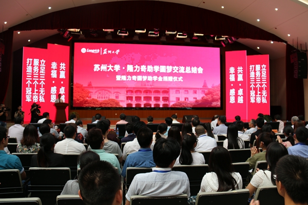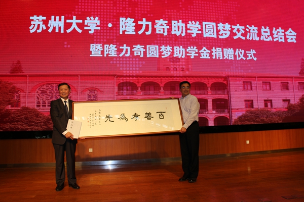 5月25日,苏州大学?隆力奇圆梦交流总结会暨隆力奇圆梦助学金捐赠仪式在常熟市隆力奇集团总部举行。原苏州市委书记、江苏省关工委常务副主任、苏州关工委名誉主任王敏生,江苏省关心下一代基金会副理事长汪文浩,苏州市市委副秘书长、办公室主任申爱军,苏州市关工委主任谢慧新,原苏州市工商局局长、江苏省关心下一代基金会副理事长、苏州分会会长戴亚东,隆力奇集团董事长徐之伟;我校党委副书记、副校长江作军,学生工作部(处)部(处)长陈晓强,相关学院(部)负责老师及100名受助学生,常熟辛庄镇相关领导和隆力奇中高层管理人员共同出席交流会。