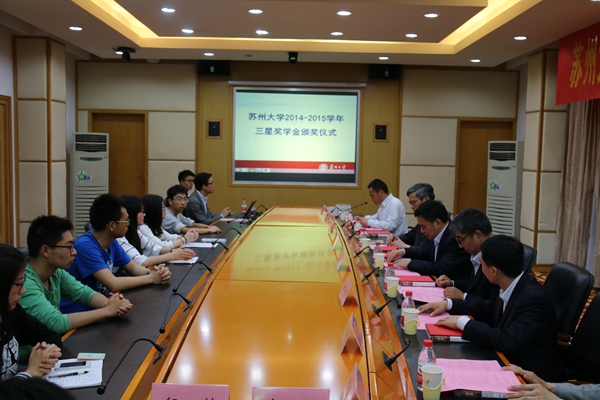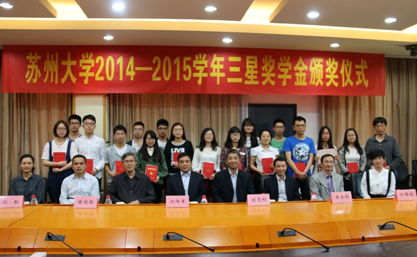 黄圣祥首先宣读了我校2014-2015学年三星奖学金的获奖名单。与会嘉宾为获奖学生颁发了证书和纪念品并合影留念。