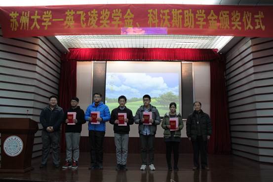 12月16日下午,苏州大学“英飞凌奖学金”、“科沃斯助学金”颁奖仪式在校本部学术报告厅举行。出席本次颁奖典礼的嘉宾和领导包括英飞凌科技(无锡)有限公司人力资源总监王晓东,人力资源经理张喜梅;科沃斯机器人股份有限公司人力资源总监李航,教育发展主管许敏琴;我校学生工作部(处)副处长陈平,发展委员会办公室副主任王培钢,电子信息学院院长、苏州市电子学会理事长赵鹤鸣,院党委书记徐群祥,副院长马国平,党委副书记、副院长黄远丰。相关奖、助学金的获得同学,部分同学代表参加了颁奖仪式。颁奖仪式由徐群祥主持。