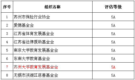 2017年1月13日,江苏省民政厅公布社会组织评估(复评)结果,评估结果共有48家获得1A-5A等级,8家复评为5A等级。苏州大学教育发展基金会再次获评江苏省5A级社会组织。