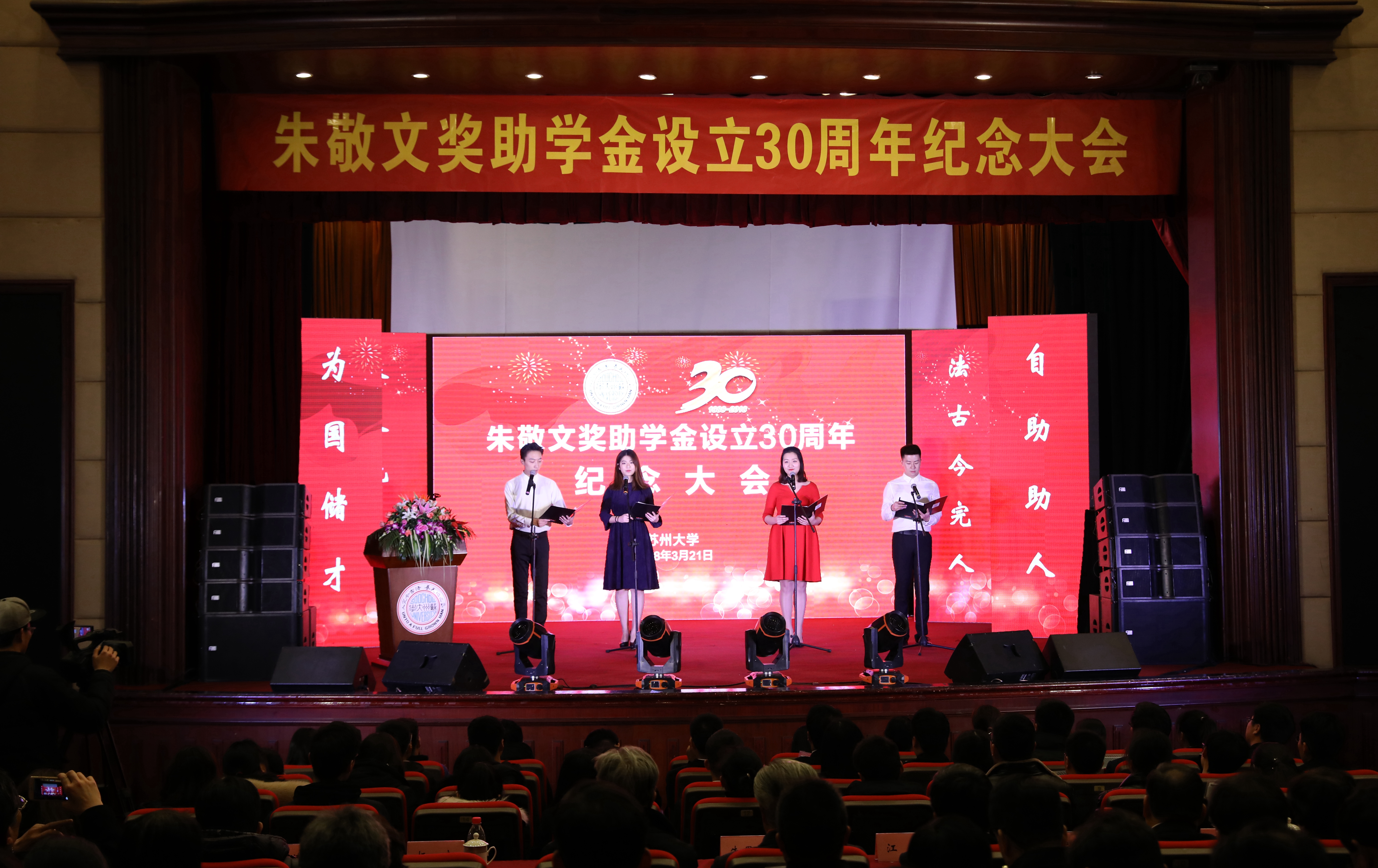 会上,与会领导、嘉宾和师生首先观看了苏州大学朱敬文奖助学金设立三十周年的微电影,共同回忆了三十年来朱敬文教育基金会在祖国大陆助学帮困的故事。作为香港著名的实业家,少年失学的朱敬文先生深知教育对于个人成才、社会进步、国家振兴之重要,早年就立下了助学报国的宏伟志愿。18岁时,经济稍得宽裕,他便着手将助学夙愿付诸行动,自此终生不辍。朱敬文先生仙逝后,长子朱恩馀等后人秉承先生遗志,继续以不同的方式资助祖国的教育事业,使敬文先生助学善举绵延至今90余载。