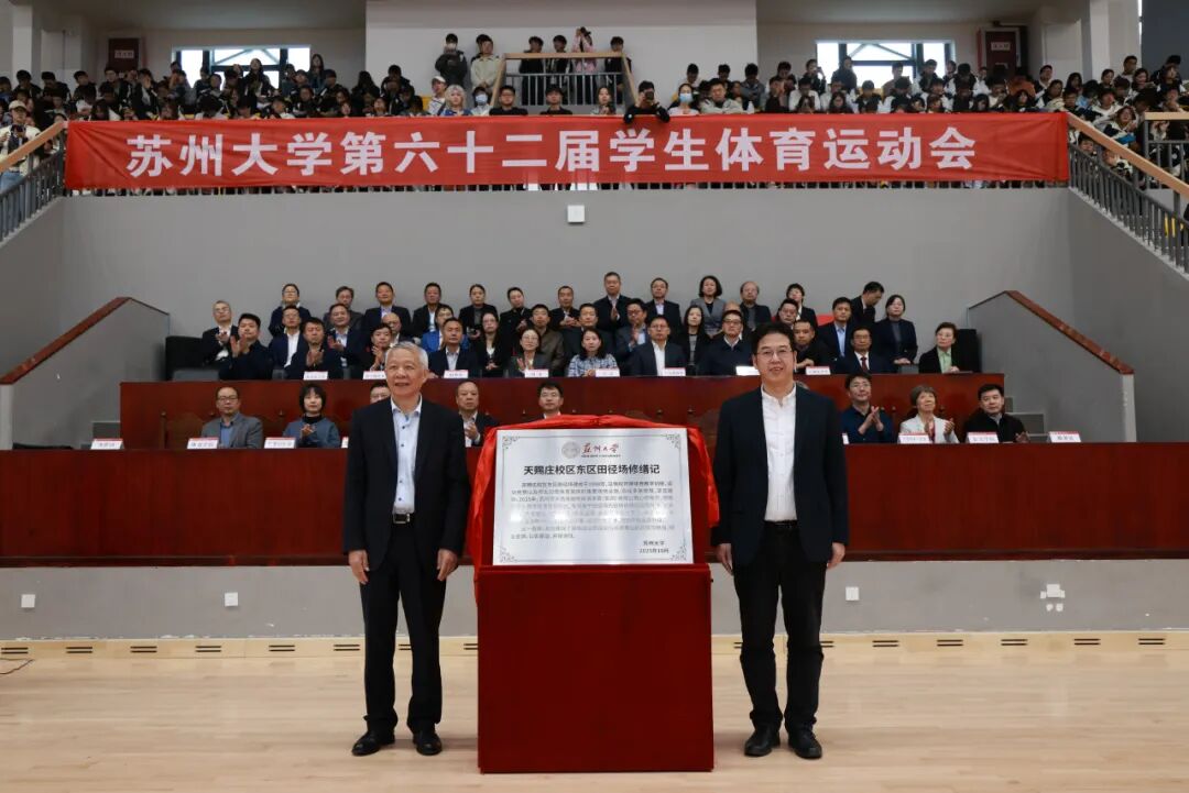 苏州苏大教育服务投资发展(集团)有限公司向苏州大学教育发展基金会捐资,专项用于东区田径场的整体修缮与设施升级。开幕式现场,韦曙和董事长和王云杰副校长共同为东区田径场捐赠纪念铭牌揭牌。