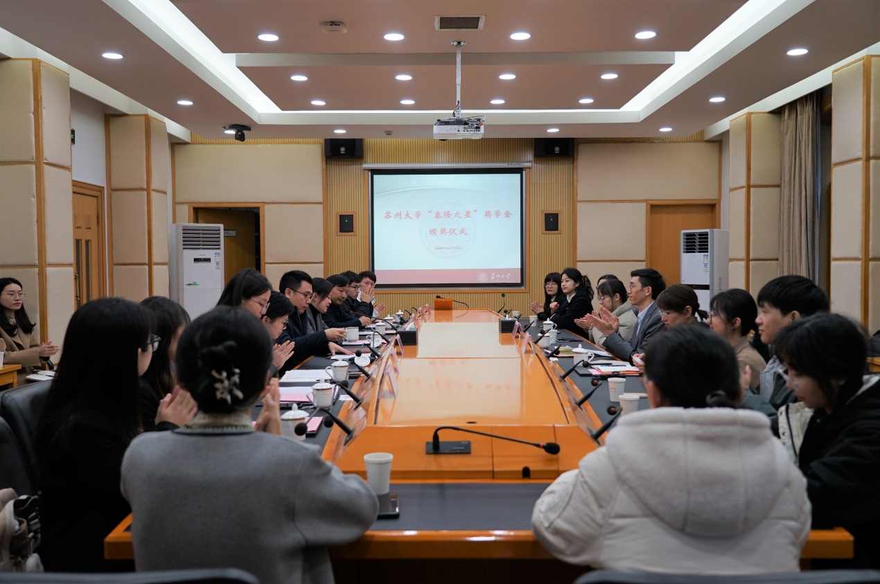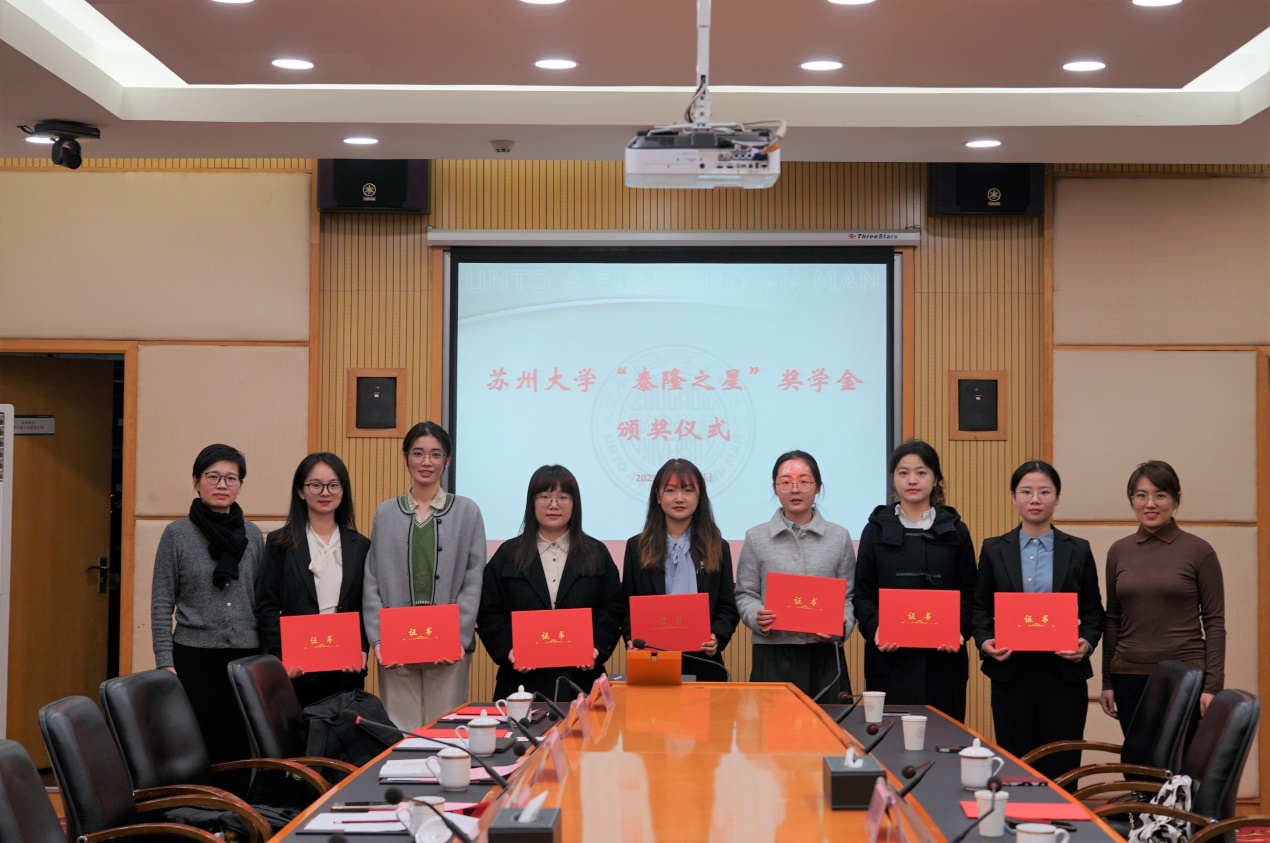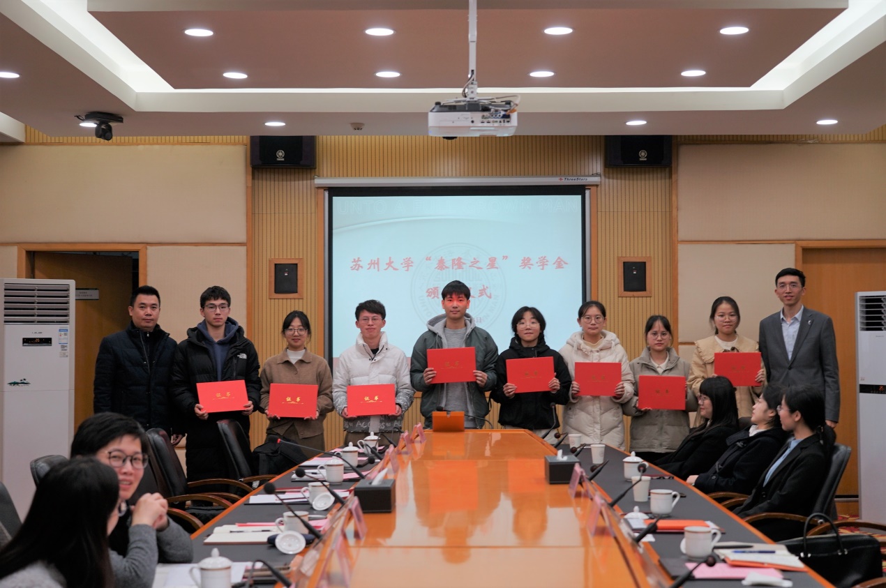 2023年12月15日上午,苏州大学“泰隆之星”奖学金颁奖仪式在红楼会议中心201顺利举行。浙江泰隆慈善基金会(以下简称:泰隆基金会)志愿单位泰隆银行苏州分行副行长宗在元、企划部总经理赵莉,苏州大学党委学生工作部副部长潘爱华、党委研究生工作部副部长徐维英等人参加了颁奖仪式。仪式由苏州大学国内合作发展处副处长、教育发展基金会副秘书长刘子静主持。