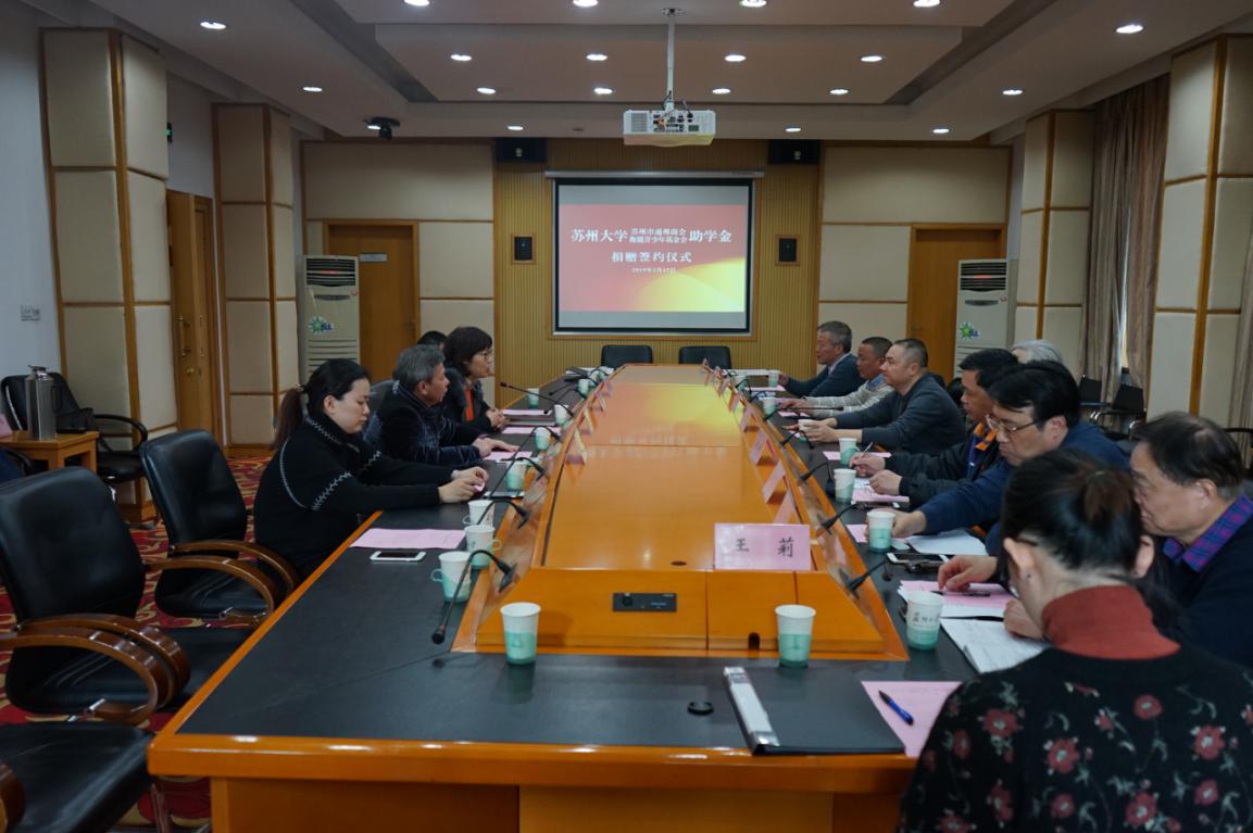 1月17日,苏州市通州商会助学金捐赠签约仪式在苏州大学红楼会议中心举行。苏州市通州商会监事长纪冬华、苏州市通州商会常务副会长王向阳、苏州市通州商会秘书长王坚等携商会捐赠企业家十余人、苏州大学发展委员会办公室主任赵阳、学生工作部(处)副处长陈平、发展委员会办公室副主任张海洋出席了捐赠仪式。捐赠仪式由张海洋主持。