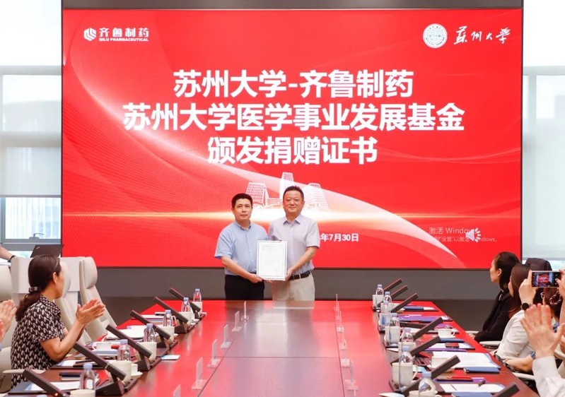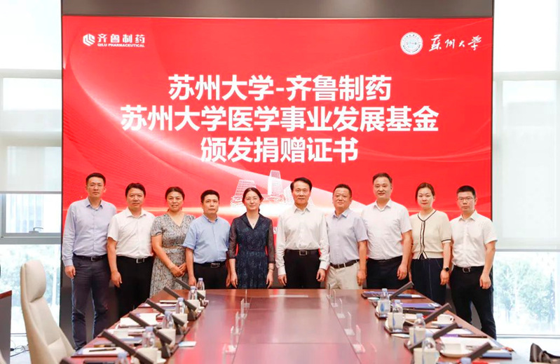 7月30日,中国工程院院士、苏州大学苏州医学院院长詹启敏、苏州医学院党工委书记钱福良、苏州医学院执行院长李斌、国内合作发展处处长、苏州大学教育发展基金会秘书长陆岸一行到齐鲁制药参观调研,齐鲁制药集团总裁李燕、集团副总裁、药物研究院院长张明会等齐鲁方领导参加活动。随后双方举行捐赠仪式。